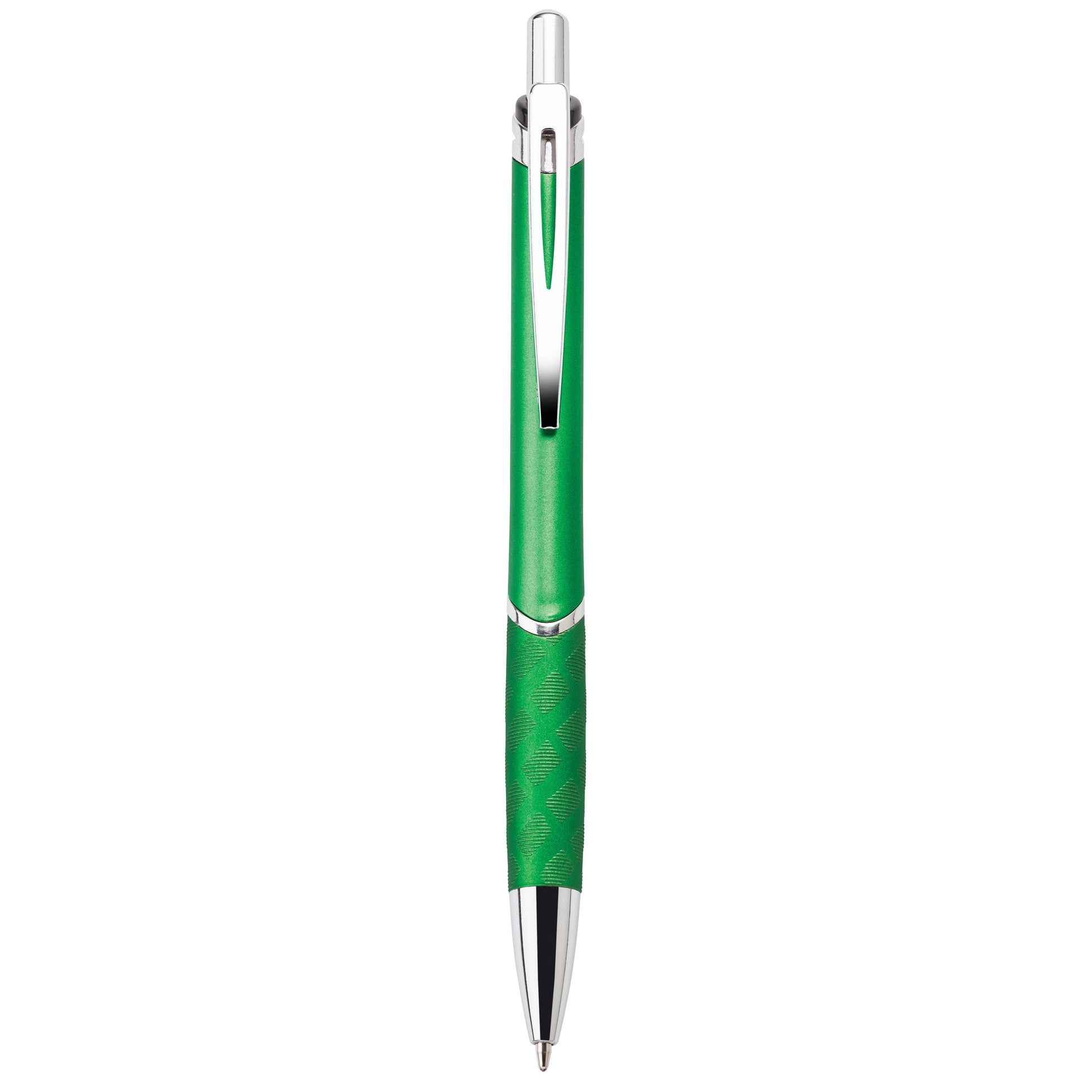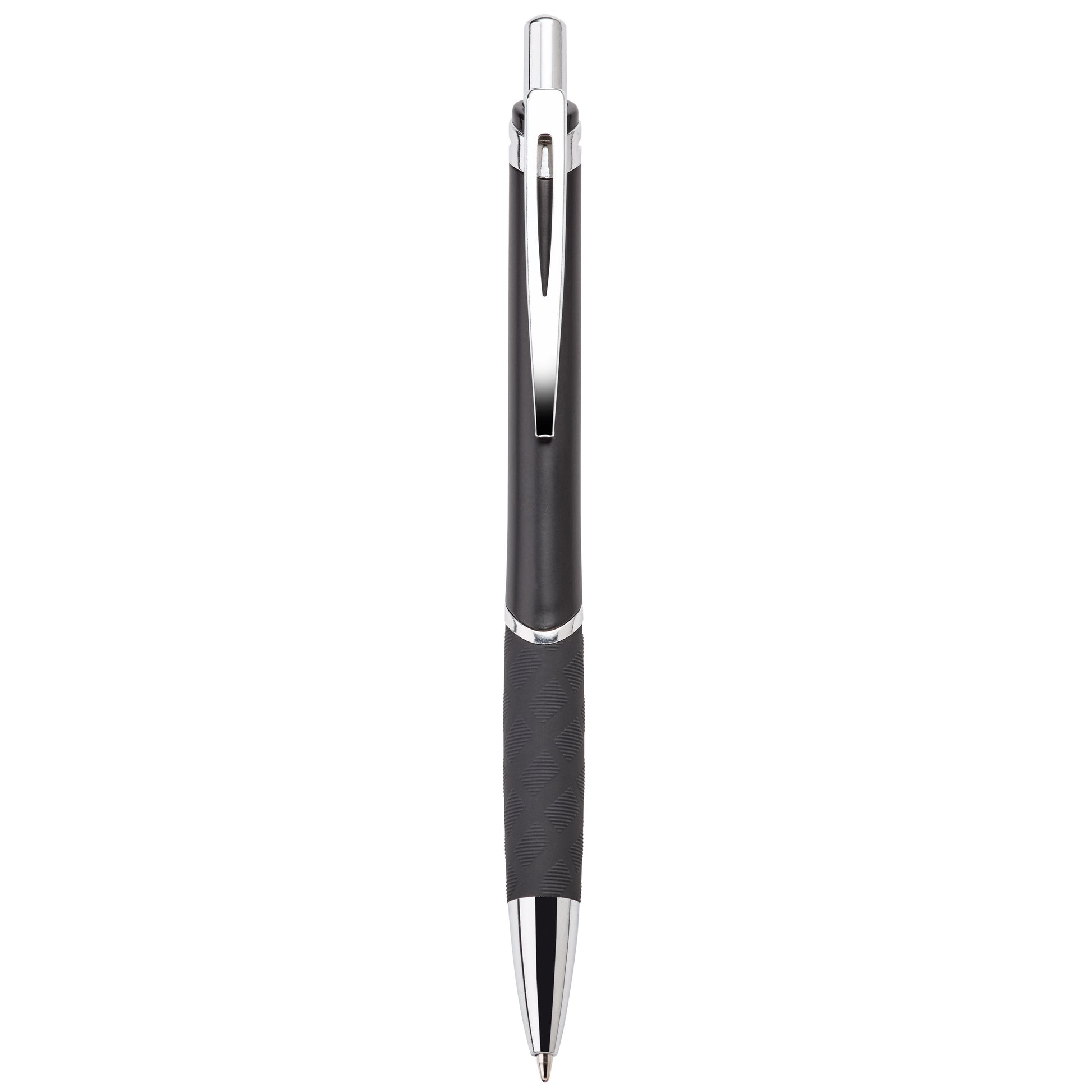This heavyweight (18.5 grams) push-action ballpoint plastic pen has a matte metallic finish, matching rubberized textured grip, chrome trim and a black accent.
