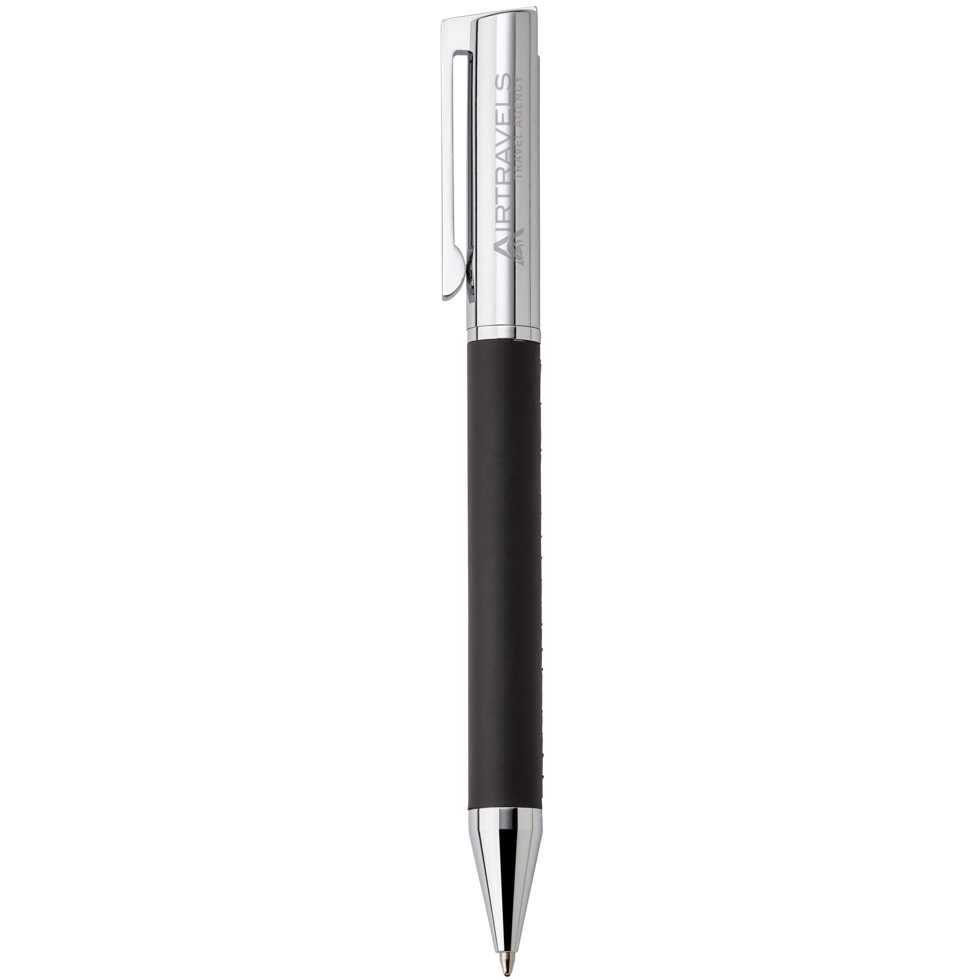 This heavyweight, twist action brass ballpoint has a chrome upper barrel and a vinyl wrapped lower barrel. Its sleek silhouette, hinged clip and german ink refill make it fit for an executive, but with a pop of color. This addition to the donald collection provides endless possibilities of pairing to create fashionable gift sets.