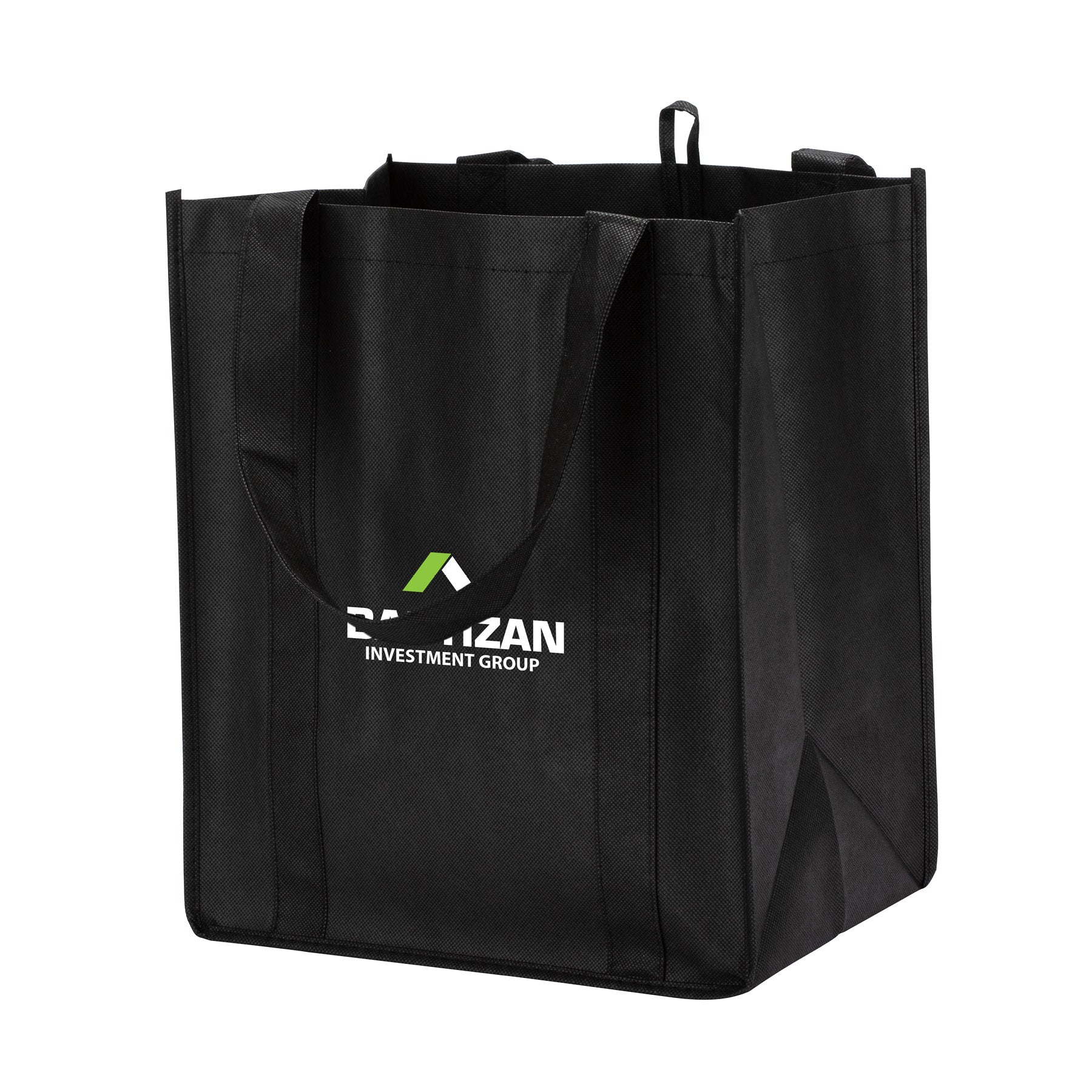 20" handles, extra-wide 8" gusset, covered bottom stiffener, small hanging loop for easy storage.