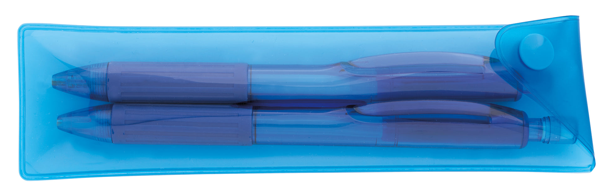 Make the mundane fun with this translucent pen/mechanical pencil pair. The ridged grips make them comfortable to hold, and they come in an unimprinted pouch to keep them together in your purse or backpack.