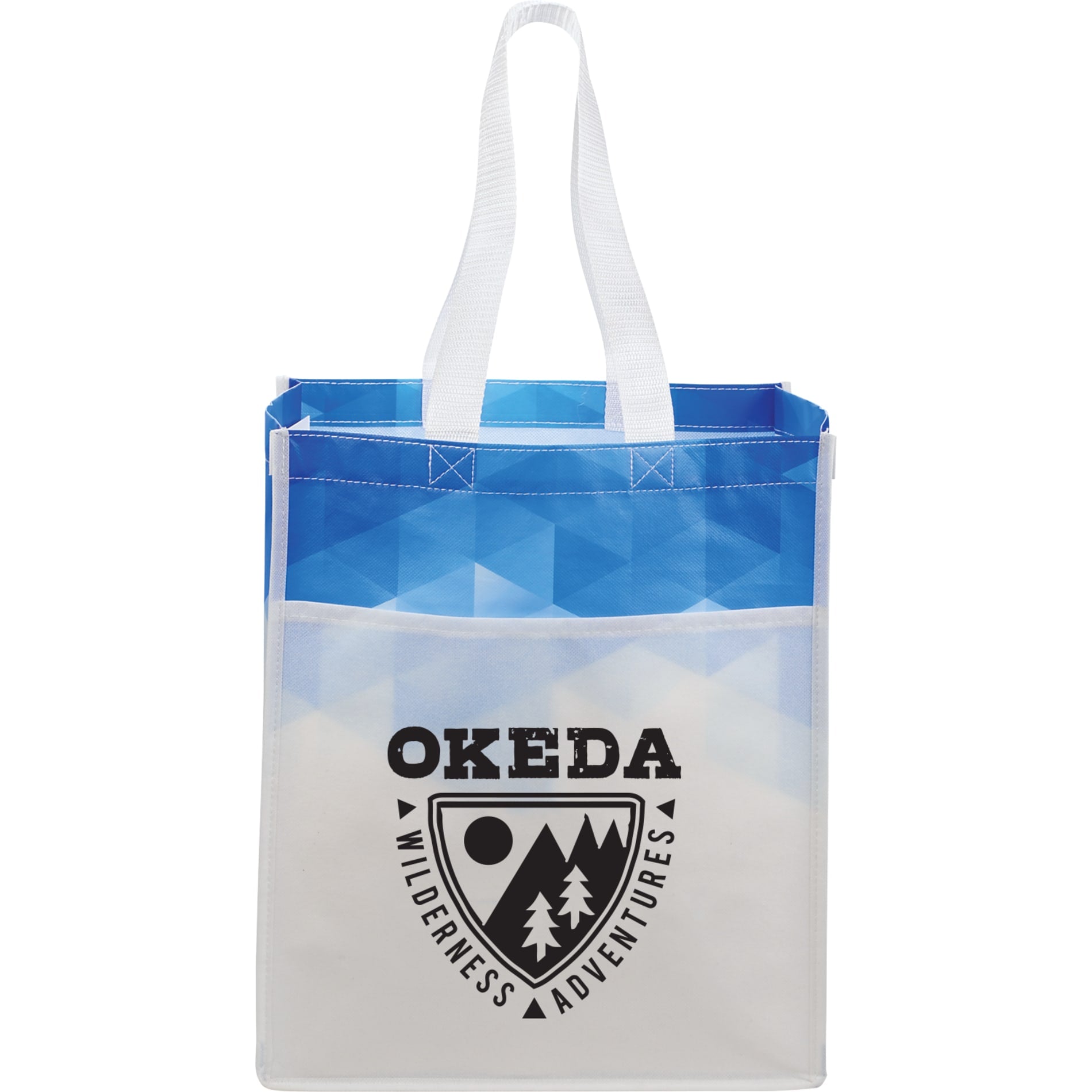 The Gradient Laminated Grocery Tote is modern, sleek and on trend. This custom tote bag features an open main compartment and a large front slash pocket. The Gradient Laminated Grocery Tote includes webbing 10"" drop height handles. This tote was previously Leed's 2150-69, Gradient Laminated Grocery Tote. Open main compartment Large front slash pocket Webbing 10" drop height handles
