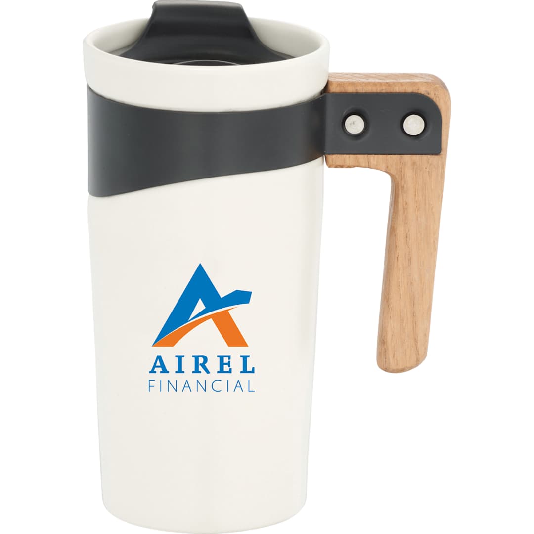 A must-have ceramic tumbler. Matte finish body and natural wooden handle are combined by the black coated stainless-steel band. Push-on, slide lock lid included. Up to 3 logo decoration spots are available. Leed's Exclusive. 16 oz. ceramic maybe hot to the touch use caution and or handle