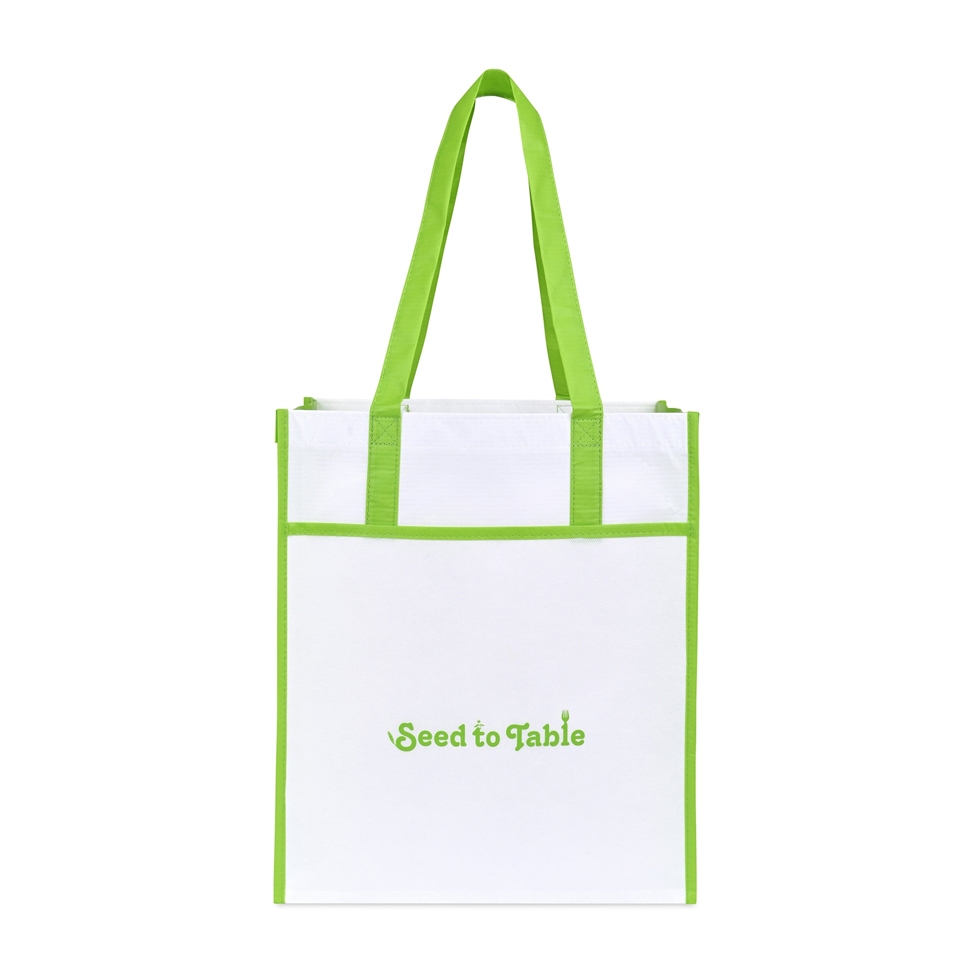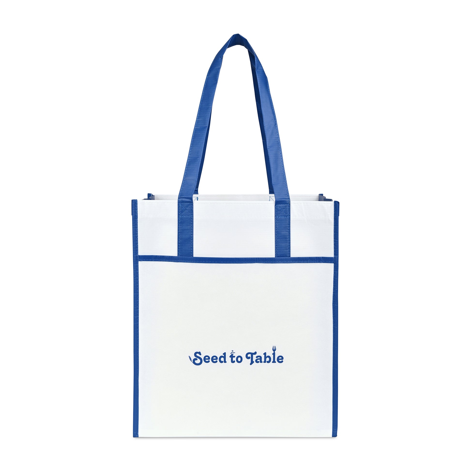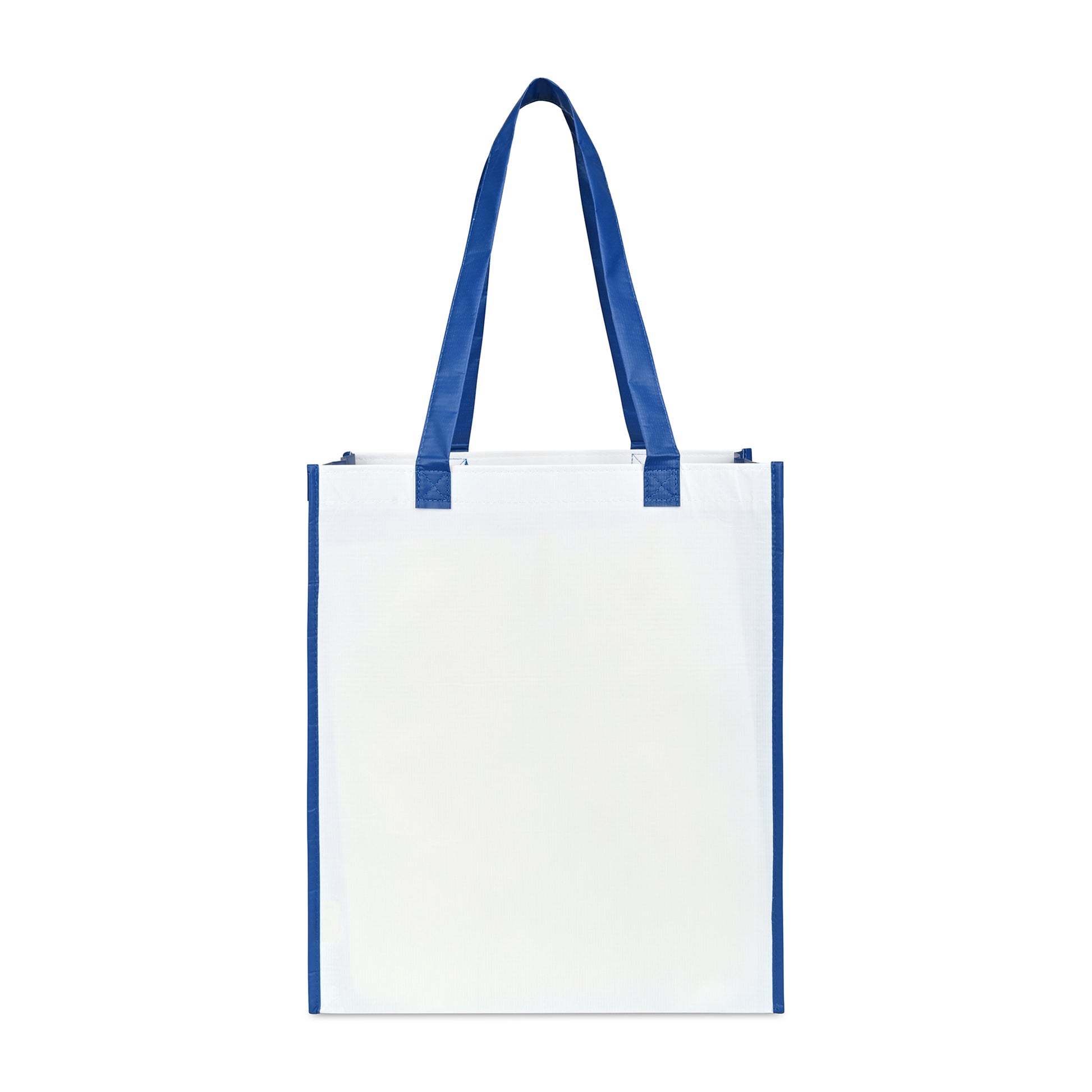 The Harlow Laminated Recycled Shopper is a durable, reusable alternative to plastic bags. With a roomy main compartment, front slash pocket, and long shoulder straps, it’s perfect for groceries, errands, or everyday carry—all in a recycled design.