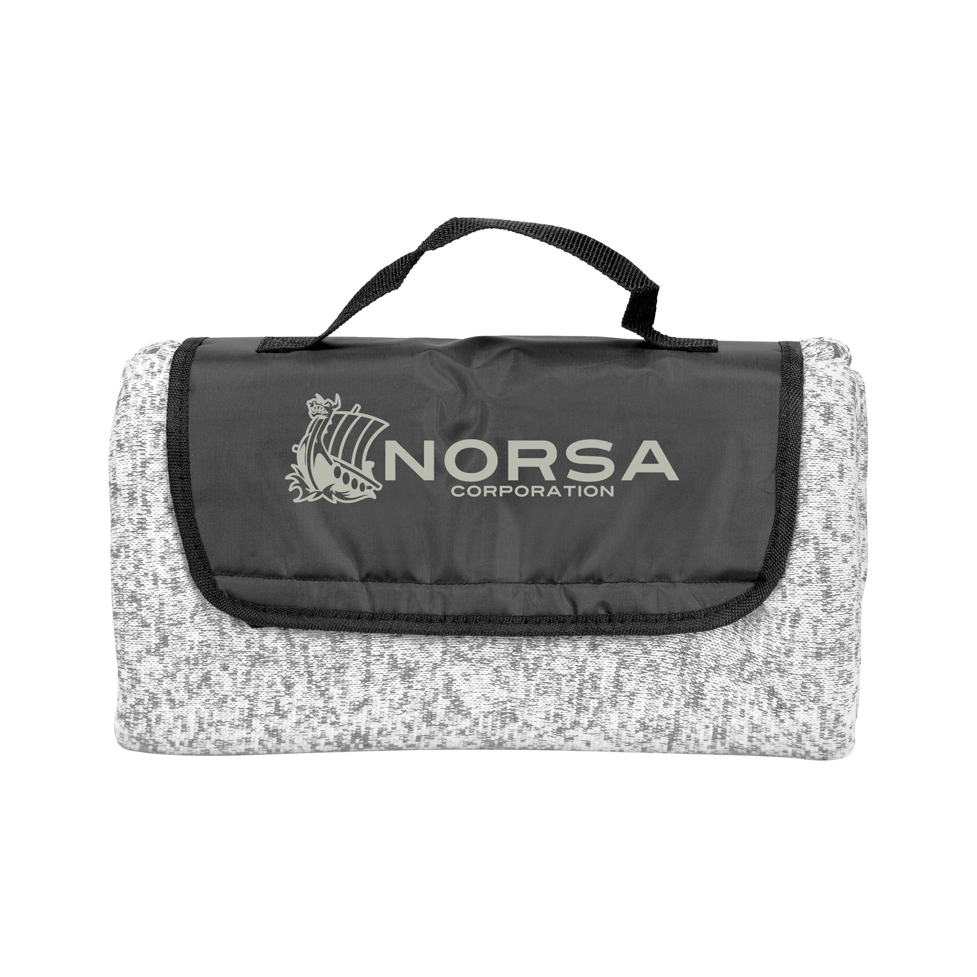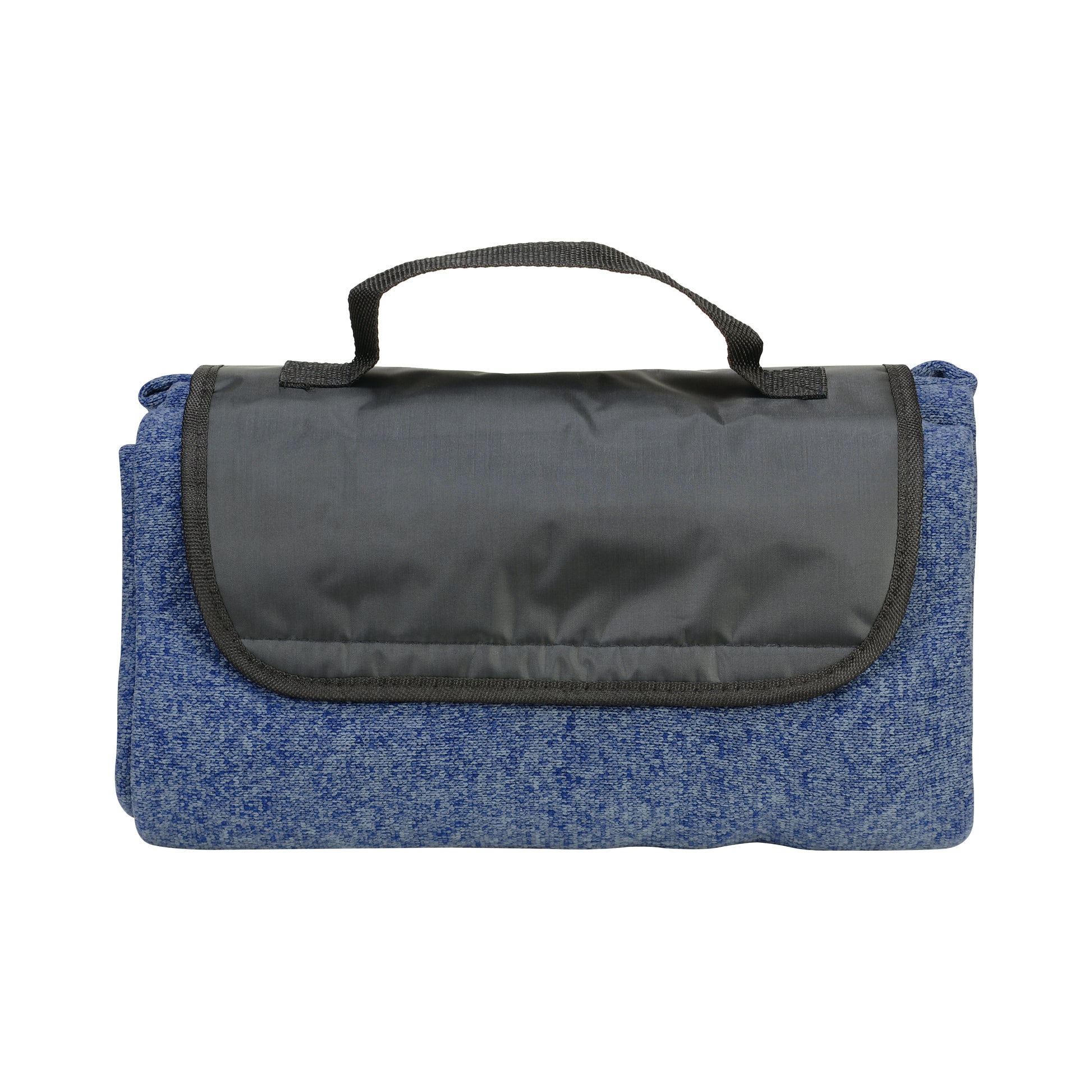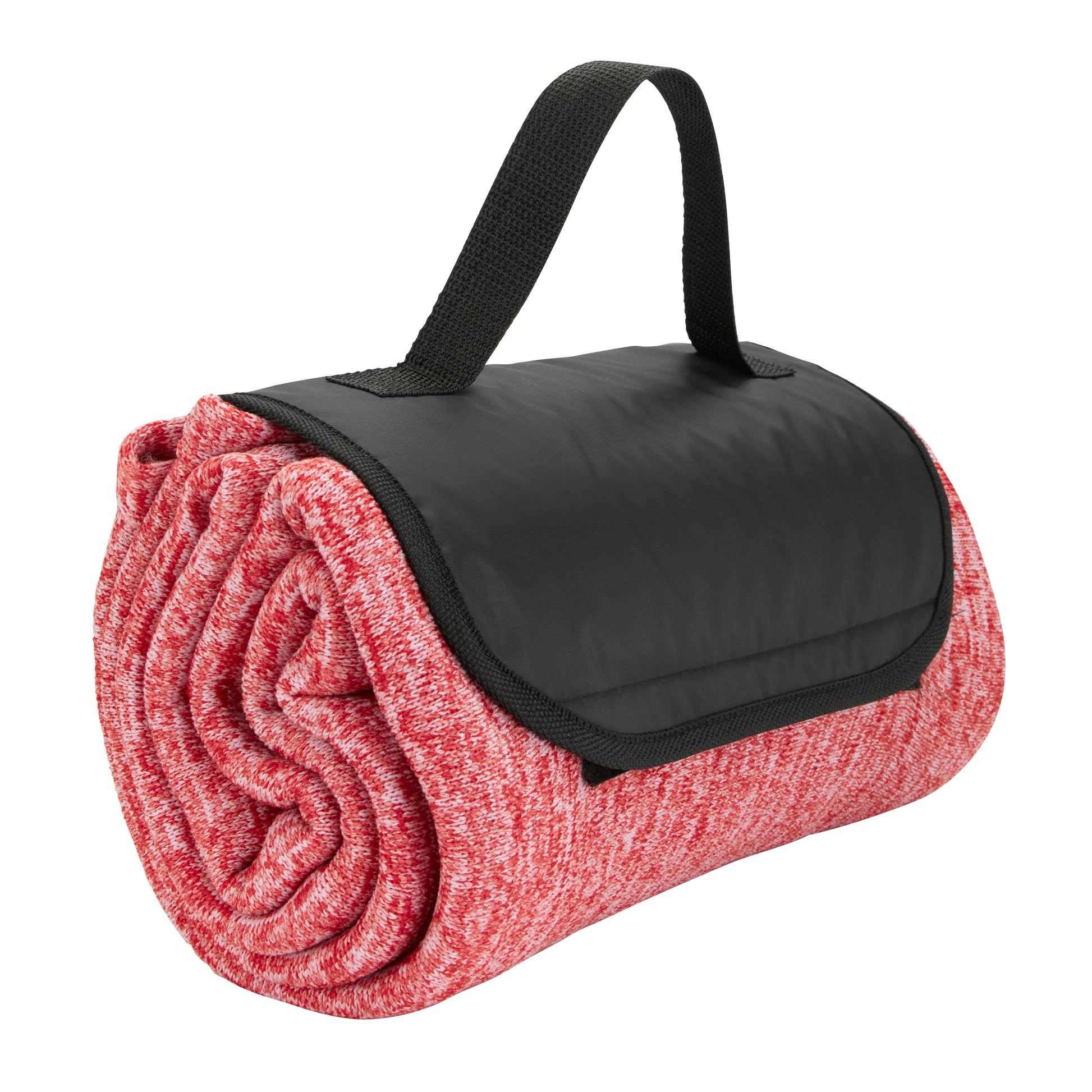 The Heathered Fold Up Blanket easily folds within itself, has an attached handle for carrying, and is made from brushed back heathered knit material.