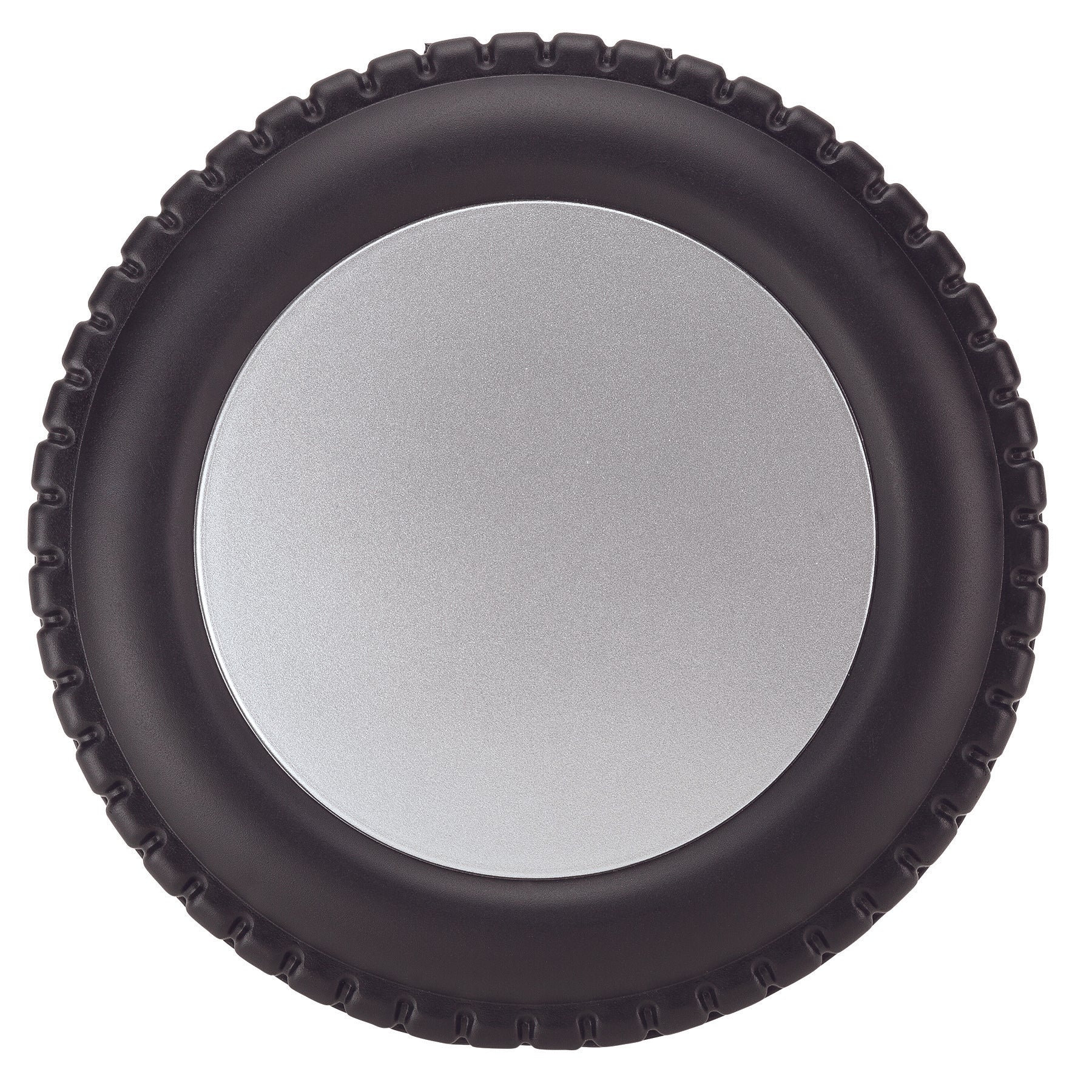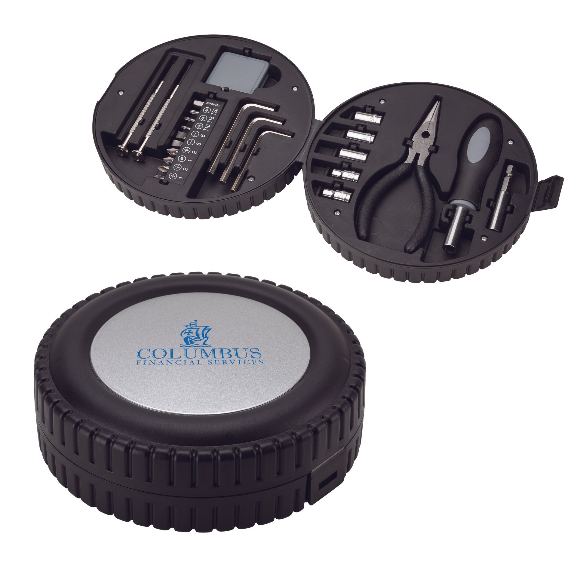 Tire-shaped tool case includes spring-loaded needlenose pliers with cutter, bit driver with 5-piece socket set, 9-piece screwdriver bit and adapter set. Also includes Phillips and flathead mini screwdrivers, 3-piece hex wrench set and a 3' tape measure with inch / metric scale.