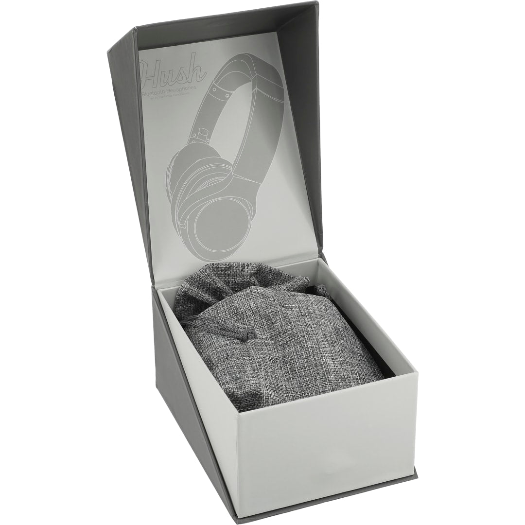 Become immersed in your music with the Hush Active Noise Cancellation Bluetooth Headphones. These headphones deliver premium stereo sound up to 15 hours at max volume. When the active noise cancellation is turned on it will block out up to 20-23db of sound. Allowing you to enjoy your long flight, train ride, or day in the office without any disruptions and in comfort with the memory foam earpads. The built-in music controls and microphone allow you to control your audio and answer a call without reaching for your phone. With a collapsible and flexible design, the headphones can be carried in the provided woven pouch or around your neck. Music can be enjoyed through Bluetooth or with the provided 20” 3.5mm Aux Cable. Playback time at max volume with ANC On: 10hrs. Charging Time: 2hrs Bluetooth Version 5.0. Micro USB charging cable provided. Bluetooth working range is 10 meters (33 feet).