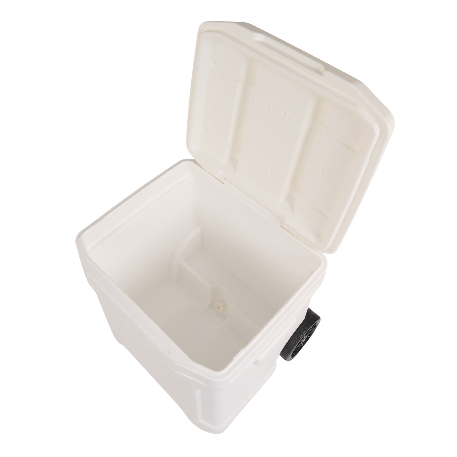 The Igloo Profile II 60-Quart Cooler is built for serious outdoor enthusiasts, offering superior ice retention and easy transport. Designed with rugged wheels and a locking telescoping handle, this cooler allows for both push and pull use, making it effortless to carry wherever you go. The Cool Riser™ Technology improves cooling performance by elevating the cooler from warm surfaces, while the molded-in side handles provide easy loading and unloading. This cooler also features Gear Hangers that hold totes, bags, and other accessories, keeping your space organized. The vertical profile is perfect for tall and longneck bottles, and the Triple-Snap, Leak-Resistant Drain Plug makes draining melted ice a breeze. With innovative THERMECOOL™ foam, which is over 50 times more environmentally friendly than traditional foam insulation, the Profile II Cooler offers up to 4 days of ice retention. It can hold up to 93 cans, ensuring you have plenty of cold beverages for your outing. Whether you’re heading to a tailgate, beach day, or camping trip, this 60-quart cooler is designed to keep your food and drinks cold and your adventure on track. Made in the USA.