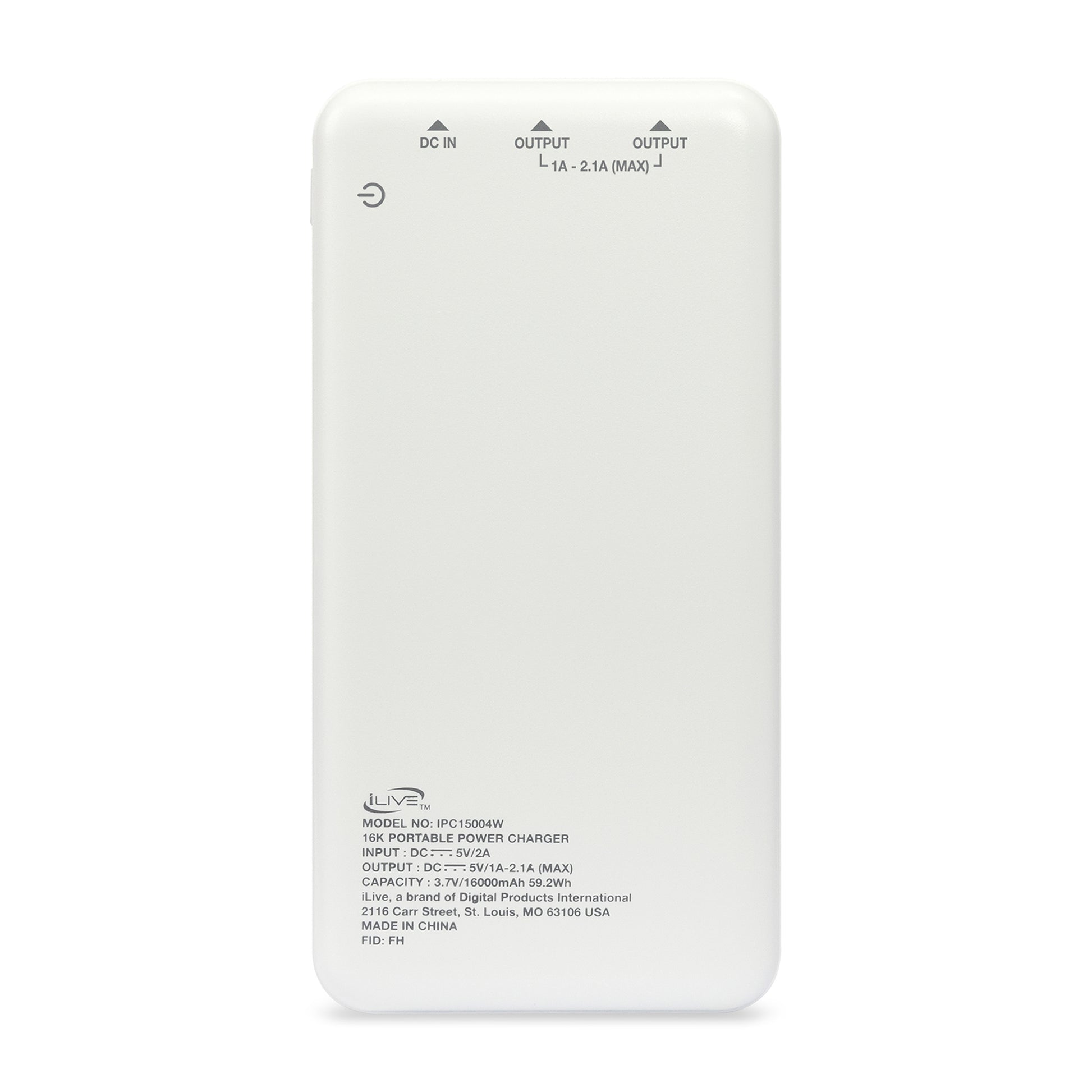 The iLive™ 16K Power Bank packs 16,000mAh of reliable power to keep devices charged on the go. With dual USB ports, USB-C and Micro USB recharging, and an LED battery indicator, it’s built for heavy use. Includes USB-C cable and gift box for ready-to-go charging support.