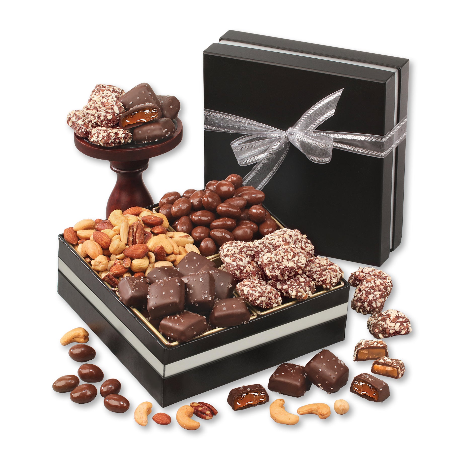 Decorative black boxes, accented by a silver stripe and tied with silver ribbon, open to reveal four exquisite treats sure to please every recipient! Crunchy butter toffee, creamy chocolate sea salt caramels, rich milk chocolate almonds, and fresh-roasted mixed nuts fill each refined box and are guaranteed delicious. We foil-stamp your logo or imprint on the box for the final touch. It's a gift they're sure to remember for years to come. Contents: Deluxe Mixed Nuts, 5 oz. Chocolate Covered Almonds, 5 oz. 12 pieces of English Butter Toffee, 5 oz. 8 Chocolate Sea Salt Caramels, 4.75 oz.