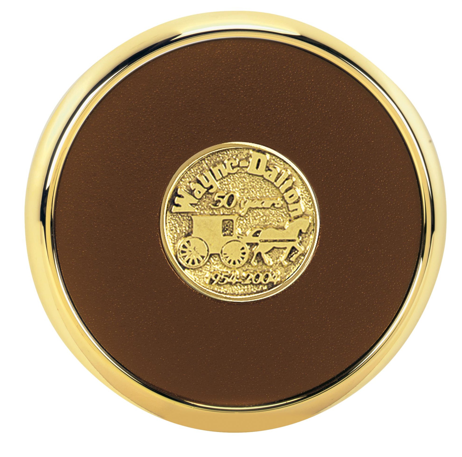 Made of brass-plated zinc these bonded leather coasters make a great gift. Leather is urethane coated to resist staining and cork backed to protect furniture. Also available in brushed-zinc (25036) and shiny-zinc (25039).