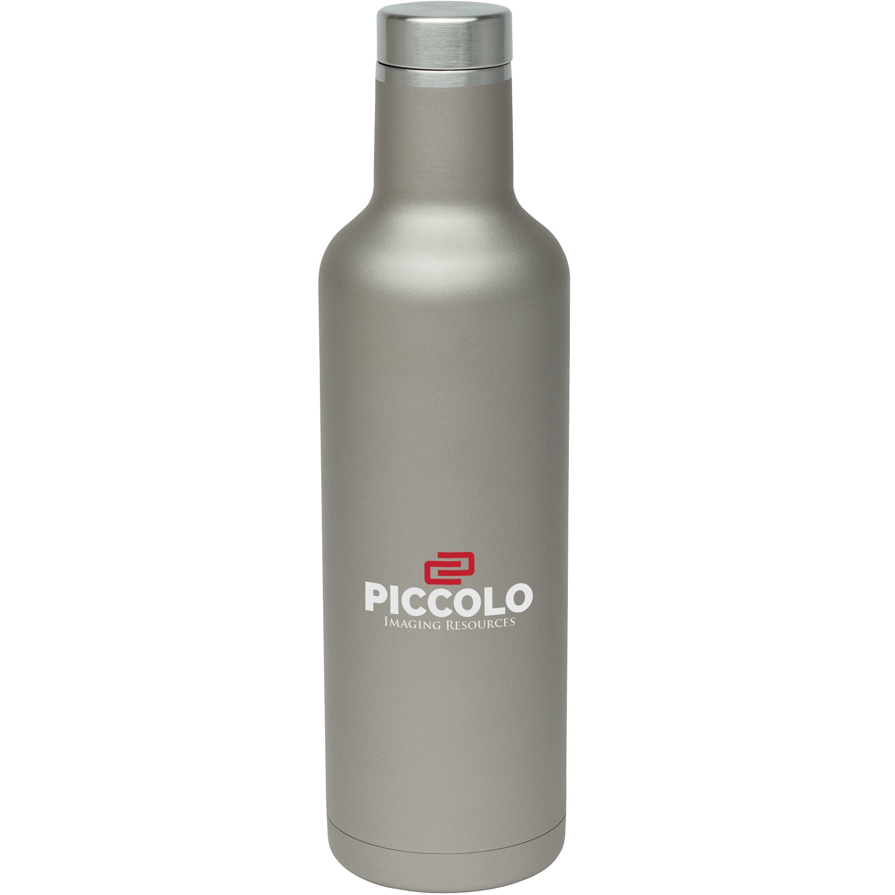 The 25 oz. Joie double wall, vacuum sealed bottle offers a smooth finish over durable 304 stainless steel, copper lining and a screw top lid. This bottle fits most car cup holders and will keep drinks cold for 48 and hot for 12. It is also conveniently sized to hold a standard bottle of wine. FDA compliant and BPA Free.