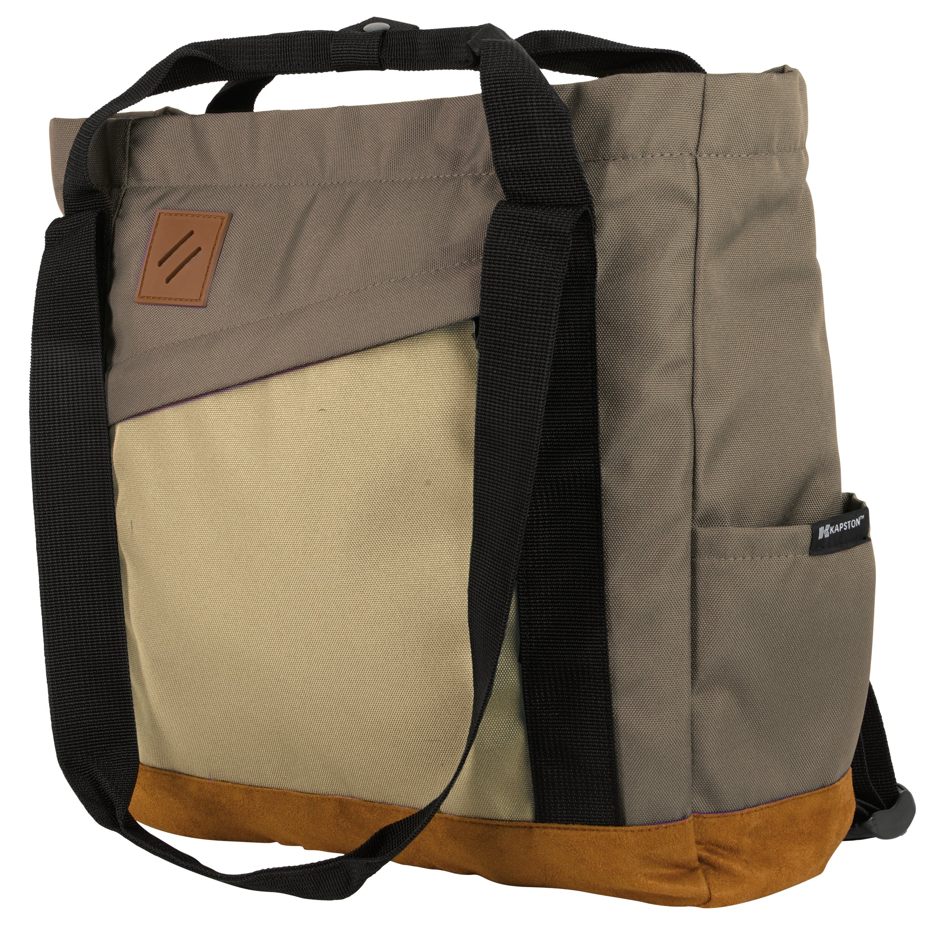 This two-tone tote-pack is made with 60% post-consumer recycled PET. Two sets of webbed handles – each a different length – allow you to carry it multiple ways. With plenty of organizing features, including a front zippered pocket, two side pockets, and a fully lined inside with padded laptop sleeve, it will keep all your belongings within easy reach. Yet, the stylish suede trim keeps this functional bag from looking too utilitarian.