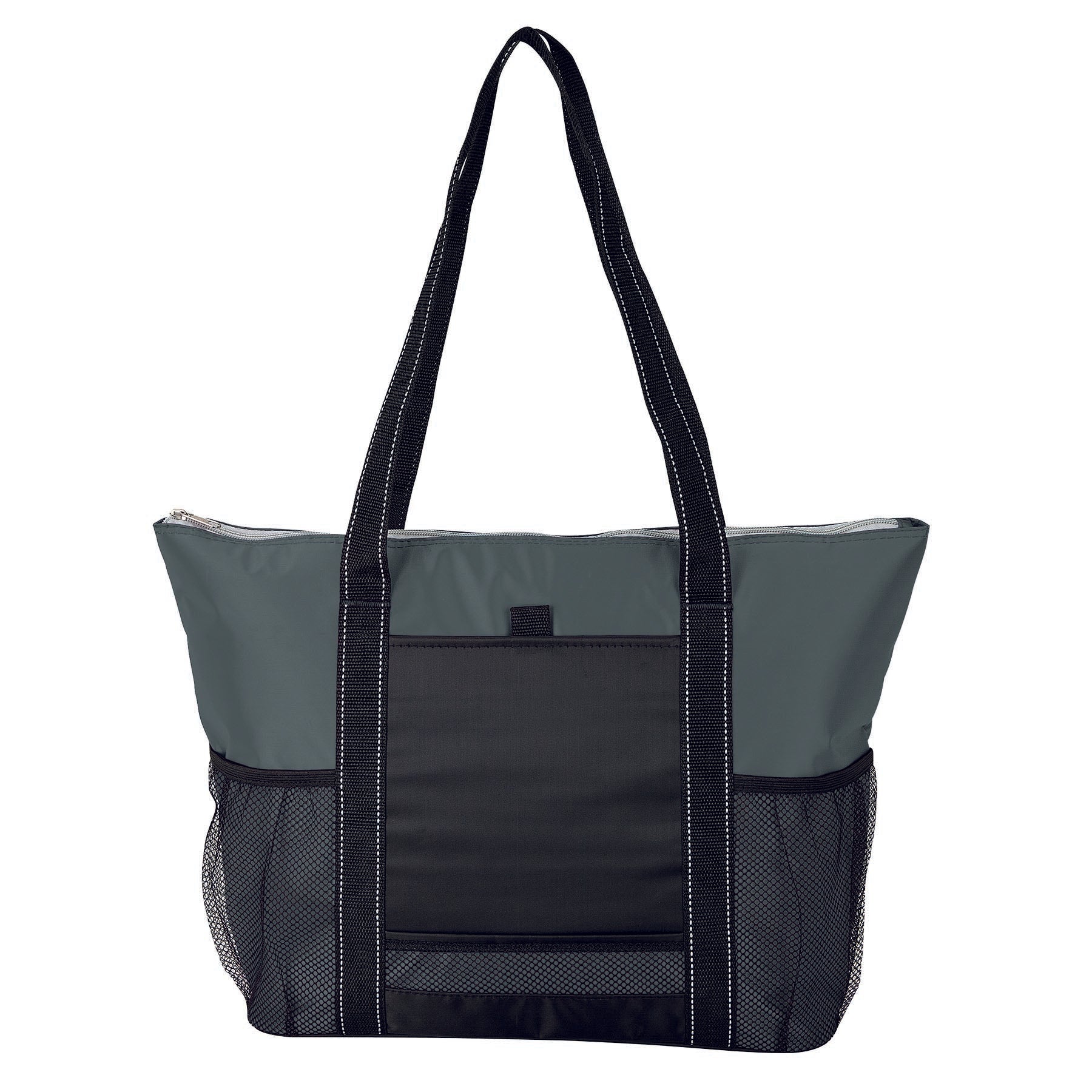 The Lakeview Cooler Tote has two front mesh pockets, front pocket with hook & loop closure, heat sealed PEVA lining, zippered main compartment and 1 1/4" x 28" handles.