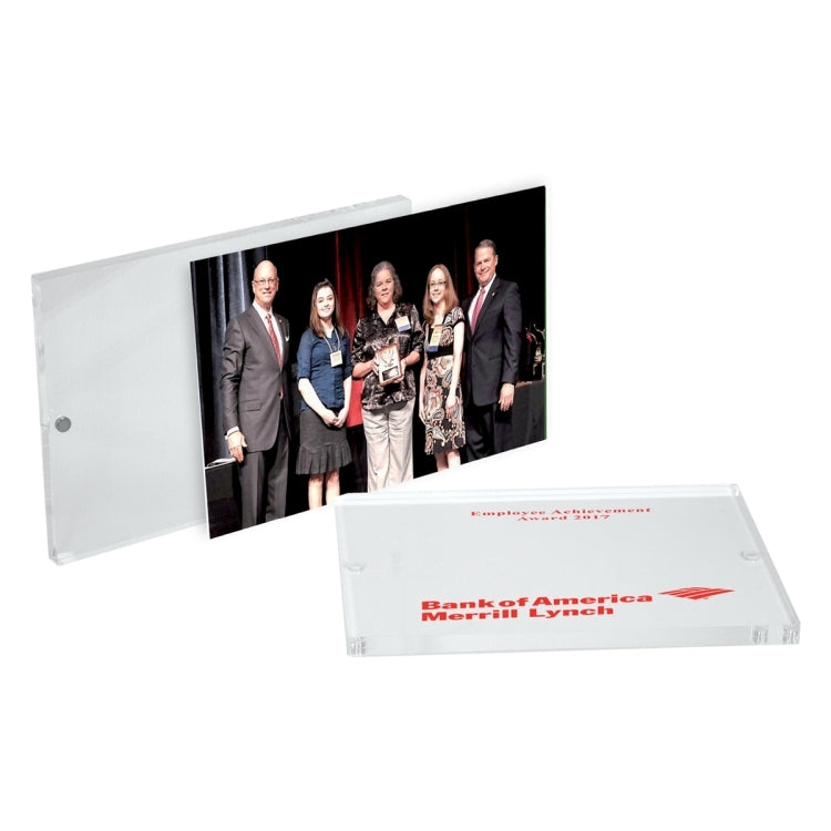 These clear acrylic frames are held together with small, but powerful, magnets. Your favorite pictures or inserts can easily be positioned inside for proud display. Choose from three popular sizes and include your Screen and laser engraved copy on the front.