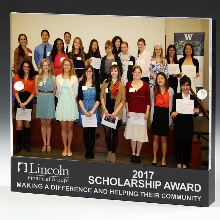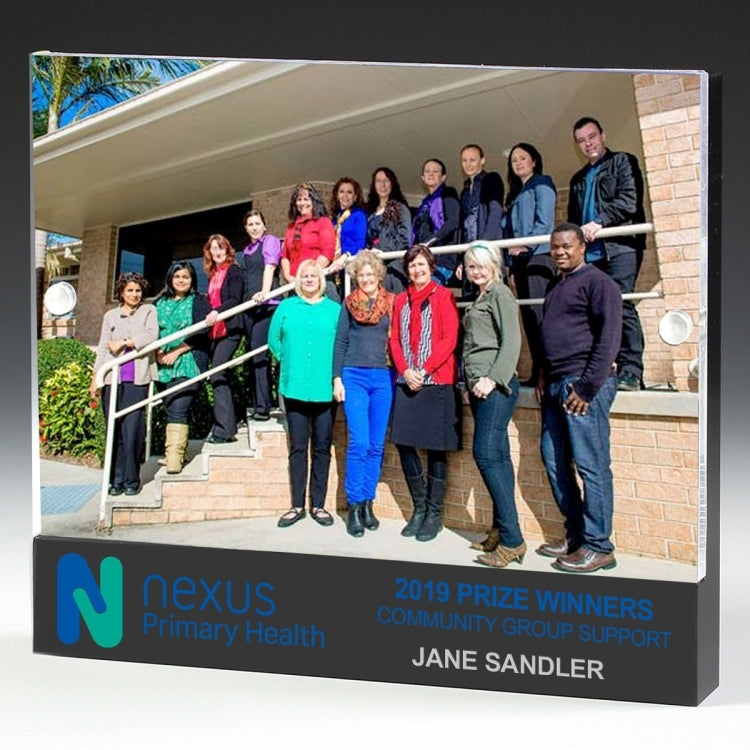 These acrylic frames are held together with small, but powerful, magnets. Your favorite pictures or inserts can easily be positioned inside for proud display. Choose from three popular sizes and include your Screen or laser engraved copy on the black base.