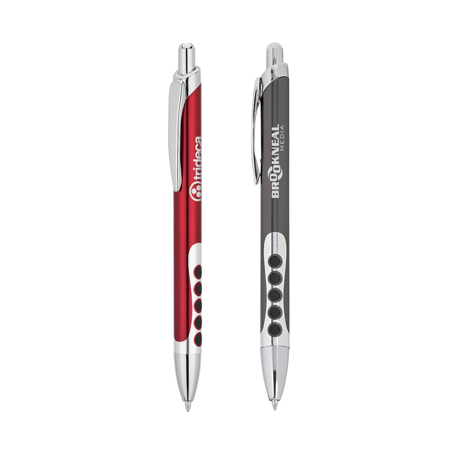 Plunge-action aluminum ballpoint pen with rubber circle designed grip and chrome accents. See details
