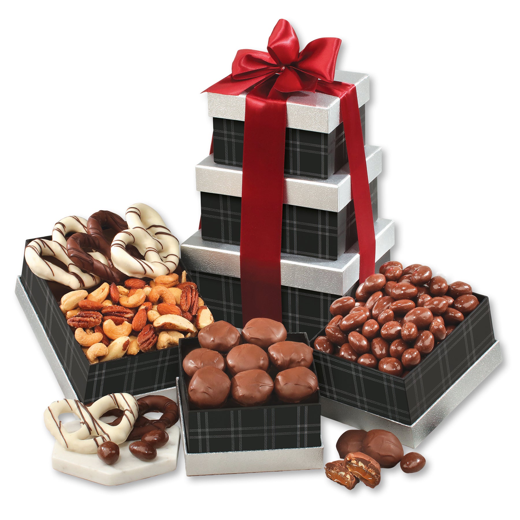 Give a gift that is sure to make a strong impact with every lucky recipient! Three black tonal plaid boxes come filled with some of our favorite gourmet treats, including our famous chocolate covered almonds. Your choice of ribbon foil-stamped with your logo in silver is a sophisticated touch. Contents: 3 Chocolate Dipped Pretzels, .8 oz. each Deluxe Mixed Nuts, 5 oz. Milk Chocolate Almonds, 5 oz. 8 Caramel Pecan Clusters, 1/4 lb.