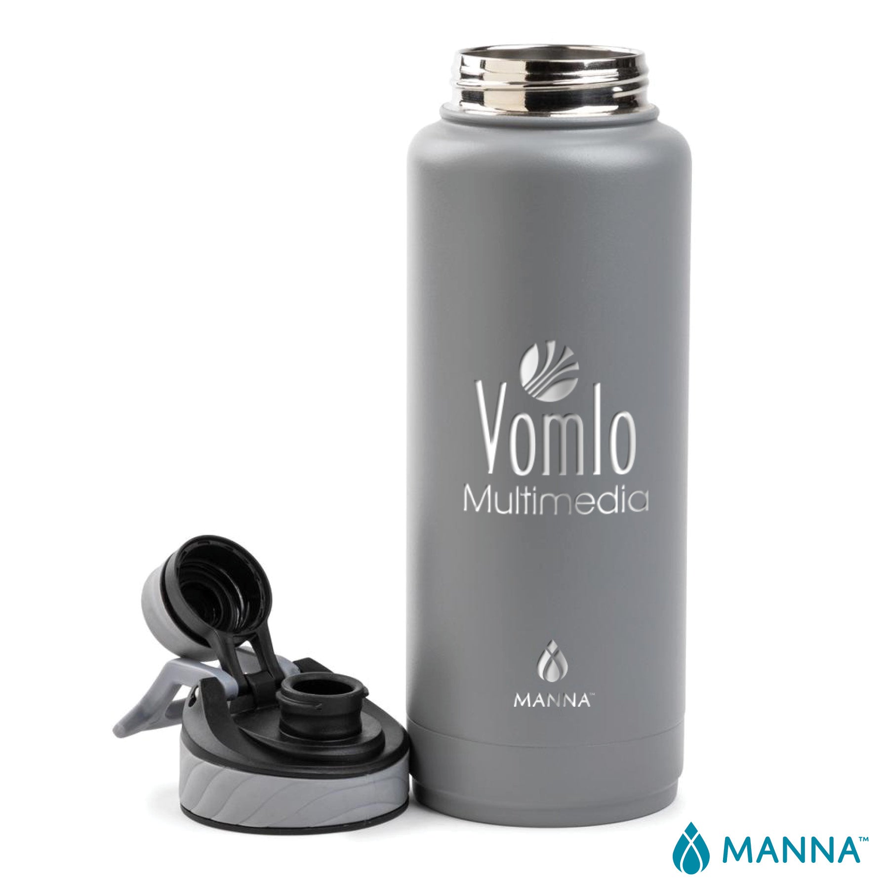 The 40oz. Manna™ Convoy double wall stainless steel water bottle is the perfect hydration companion for the office, gym or your travels. The vacuum sealed construction will keep your iced drinks cold for 24 hours and your hot drinks hot for 12 hours and the dual-opening lid makes the Convoy easy to drink from and easy to clean and add ice. The lid also features a unique ergonomic hinged T-bar handle making it easy to carry with you. Gift this FDA compliant and BPA free mug to your new hires and business associates.