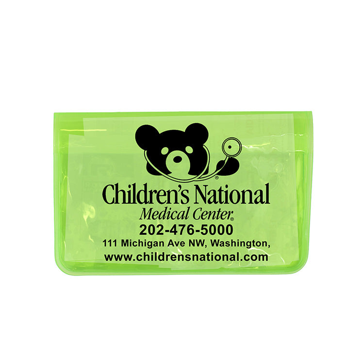 This vinyl pouch contains: 4 Standard Size Latex Free Bandages, 2 Moist Towelettes, 1 Antibacterial Hand Sanitizer Packet and 1 Healthy Guidelines Insert.
