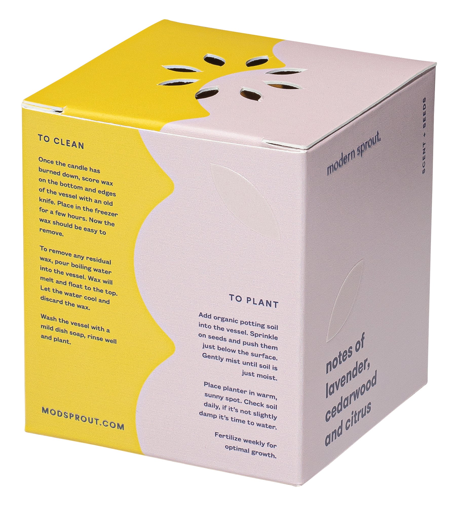 A 6oz soy-blend scented candle is outfitted in a matte glazed ceramic vessel and includes an organic seed packet to grow plant once the candle has been burned down. Candle and seed packet are packaged inside a beautifully designed box for easy gifting. Plastic-free packaging. 42 hour burn time. Gift box dimensions: 3.5’’L x 3.5’’W x 3.75’’H