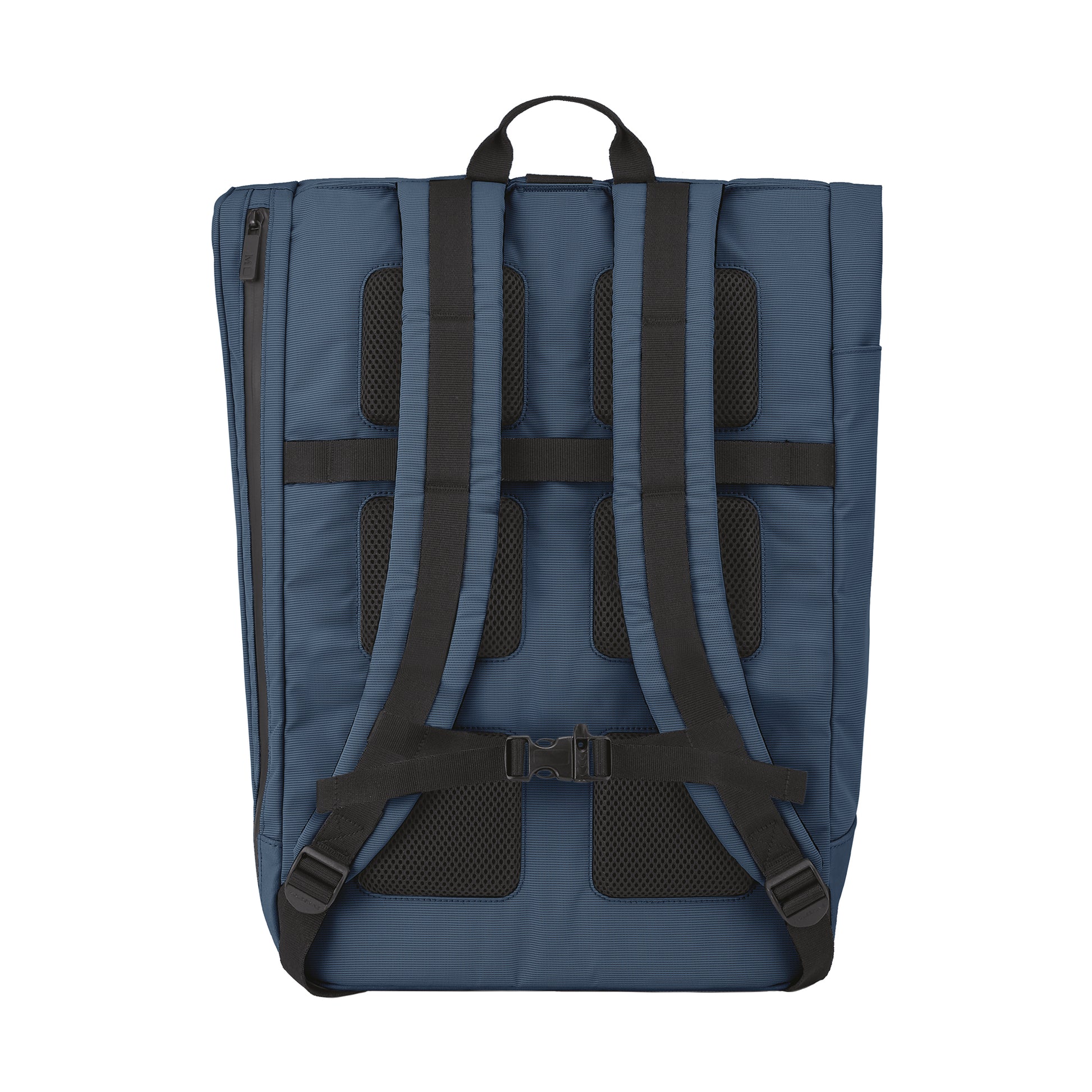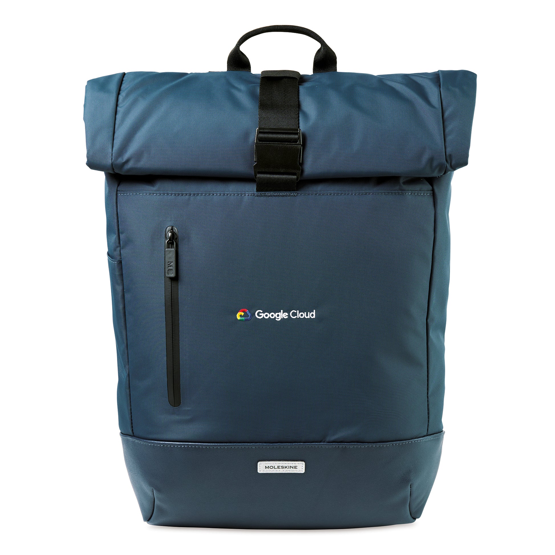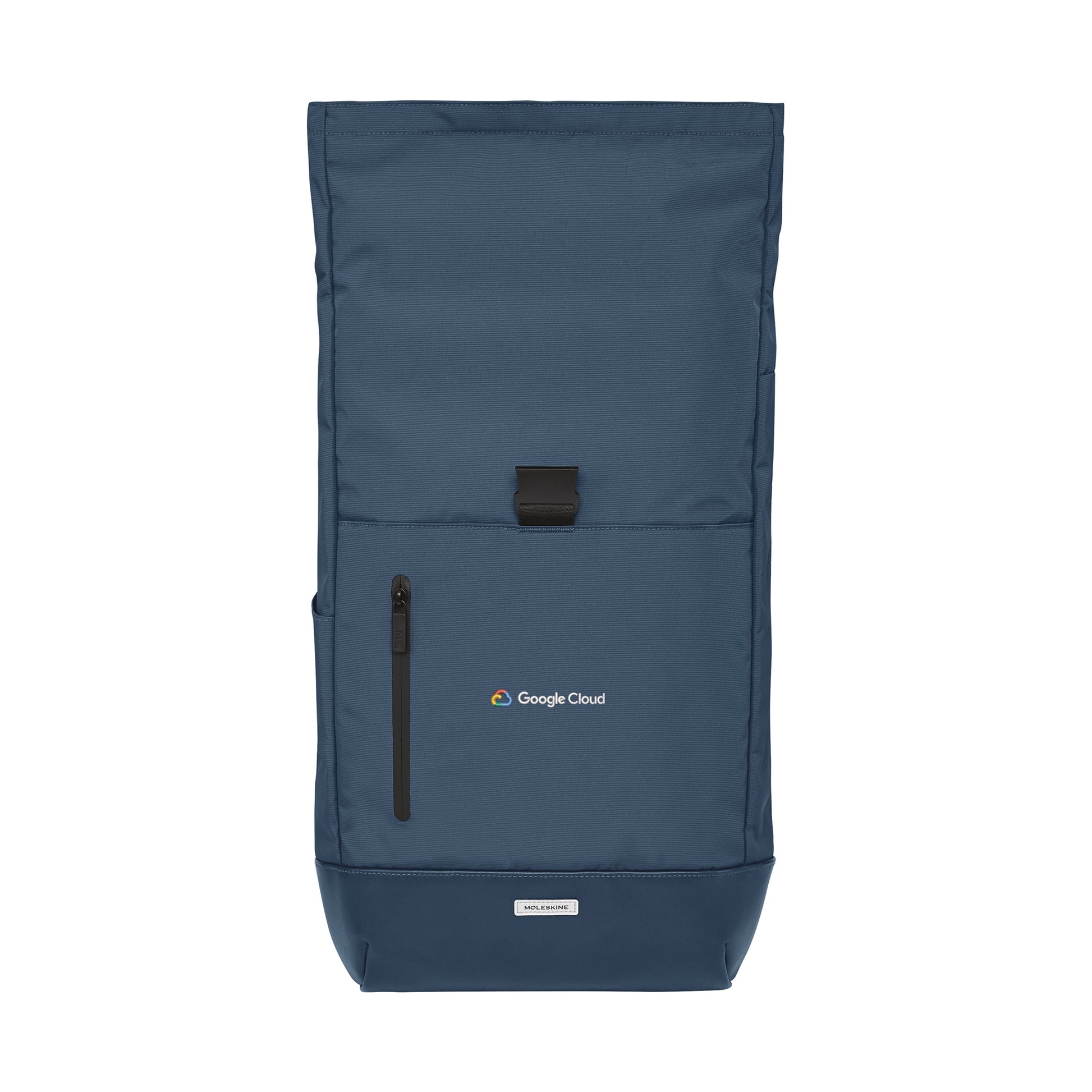 The Moleskine® Metro Rolltop Backpack combines minimalist design with functional detail for city life on the go. The rolltop main compartment with adjustable buckle closure expands to a 30L capacity, while the padded interior safely fits laptops up to 15". Thoughtful features include multiple zip pockets, breathable air-mesh back, sternum strap with whistle, and luggage trolley strap for travel ease.