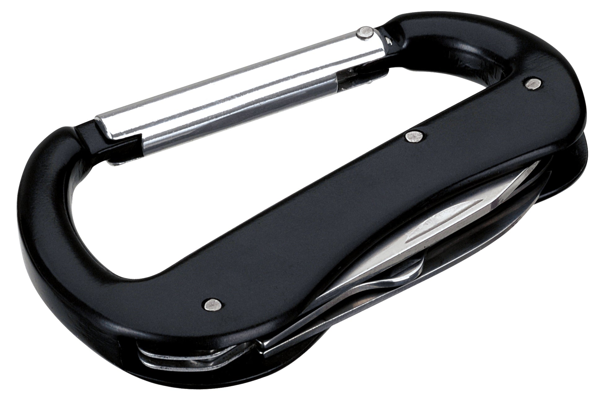 Keep your logo handy in a pinch - this carabiner features a pocket knife, fold-away scissors and screwdriver/nail file. Perfect for outdoor events.