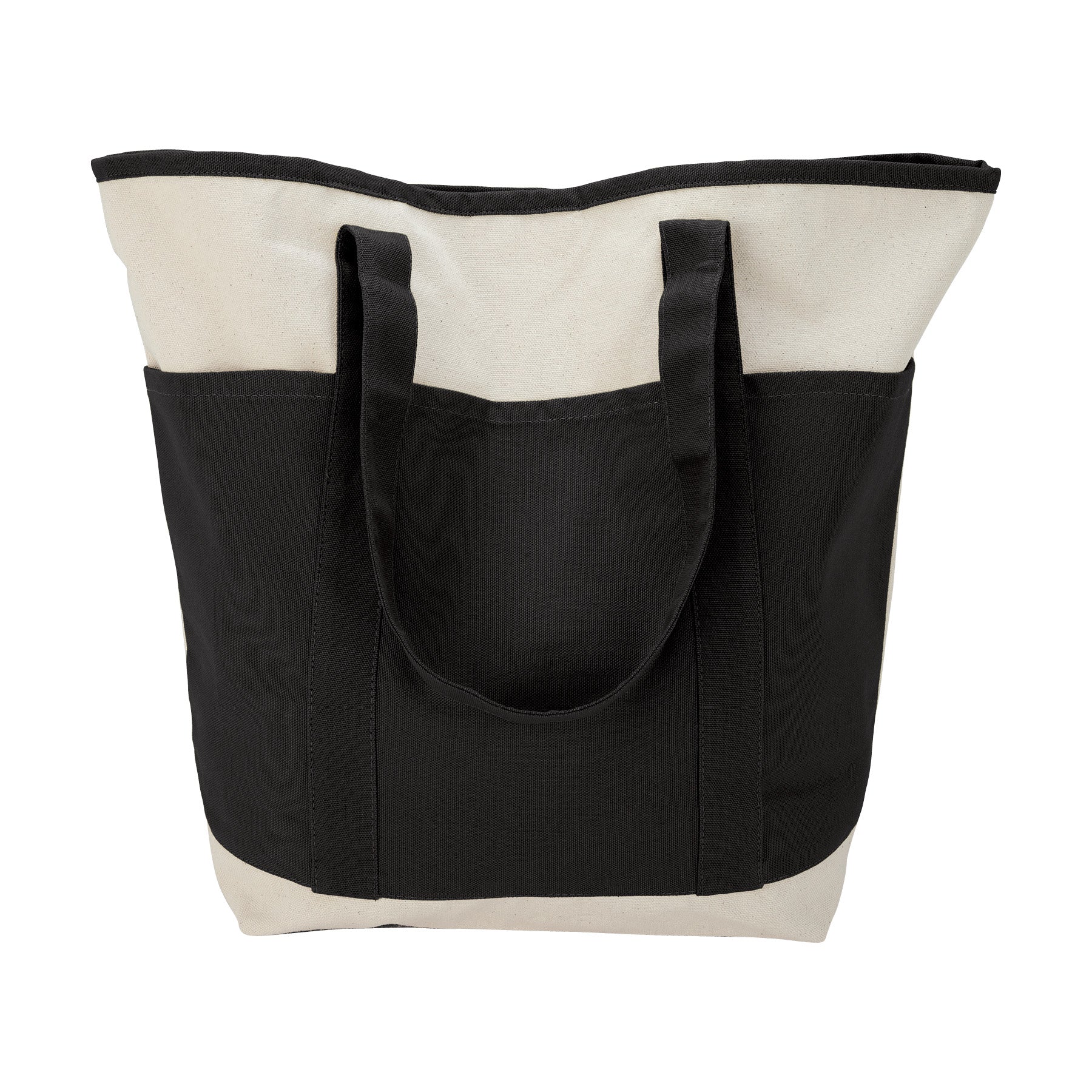 Natural 10 oz. cotton canvas two-tone tote offers three front pockets and a 5 3/4" x 4 1/4" tethered zippered pouch inside. There are also a 5 1/2" gusset, hook and loop closure and 22" handles.