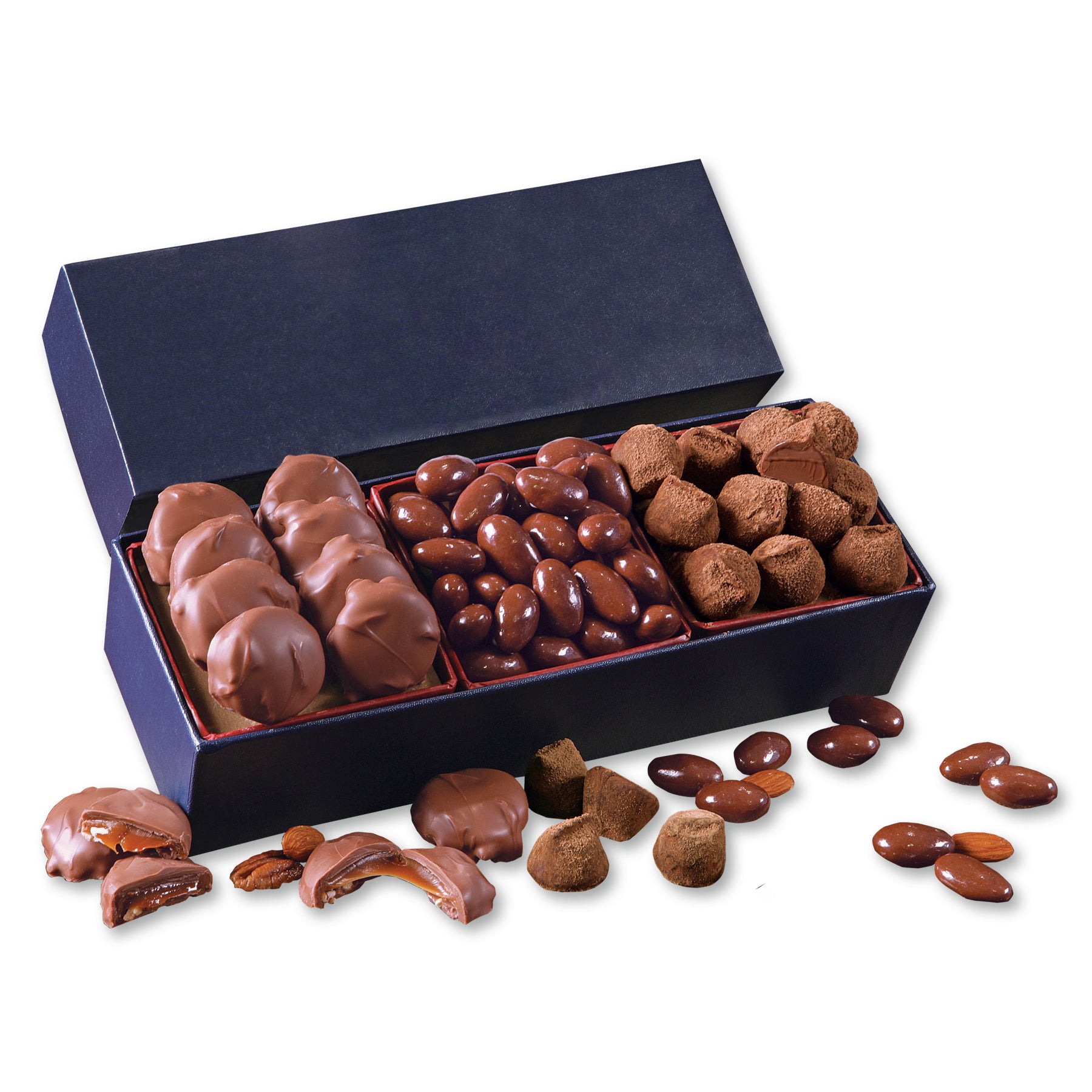 Here you will find the finest premium chocolates nestled within stylish gift boxes. Our navy Gift of Distinction is filled with 8 mouth-watering Caramel Pecan Clusters, made with creamy caramel and full-flavored pecans, approximately 40 of our famous Chocolate Covered Almonds and 11 rich and creamy melt-in-your-mouth Cocoa Dusted Truffles. Nearly a pound of sweet temptation! Your logo is foil-stamped in white on the gift box. Serves 8-12. Contents: 8 Caramel Pecan Clusters, 1/4 lb. Milk Chocolate Almonds, 5 oz. 11 Cocoa Dusted Truffles, 3.5 oz.
