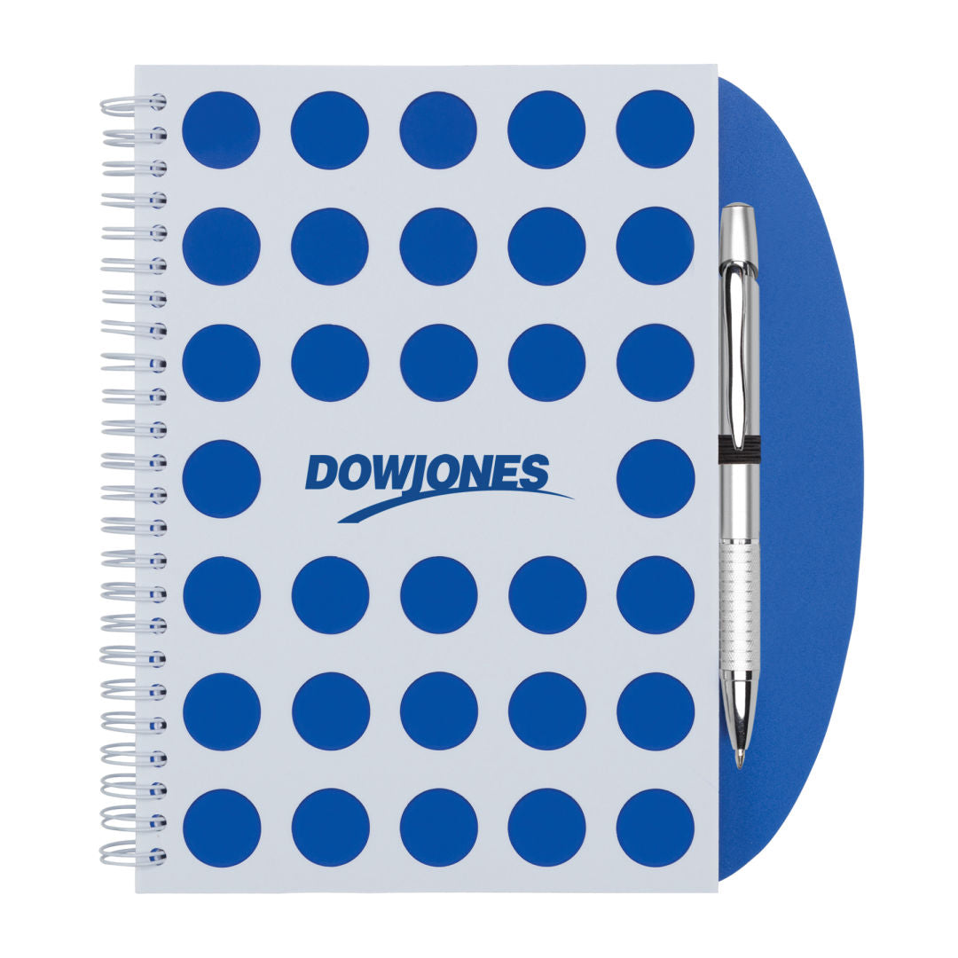 5 7/8" x 8 3/8" polypropylene notebook with white double spiral binding, white frosted front cover with die-cut holes, colored front page, matching elastic pen loop on cardboard back cover, 60 white lined sheets (non-refillable) and a matching P2123 plastic pen.