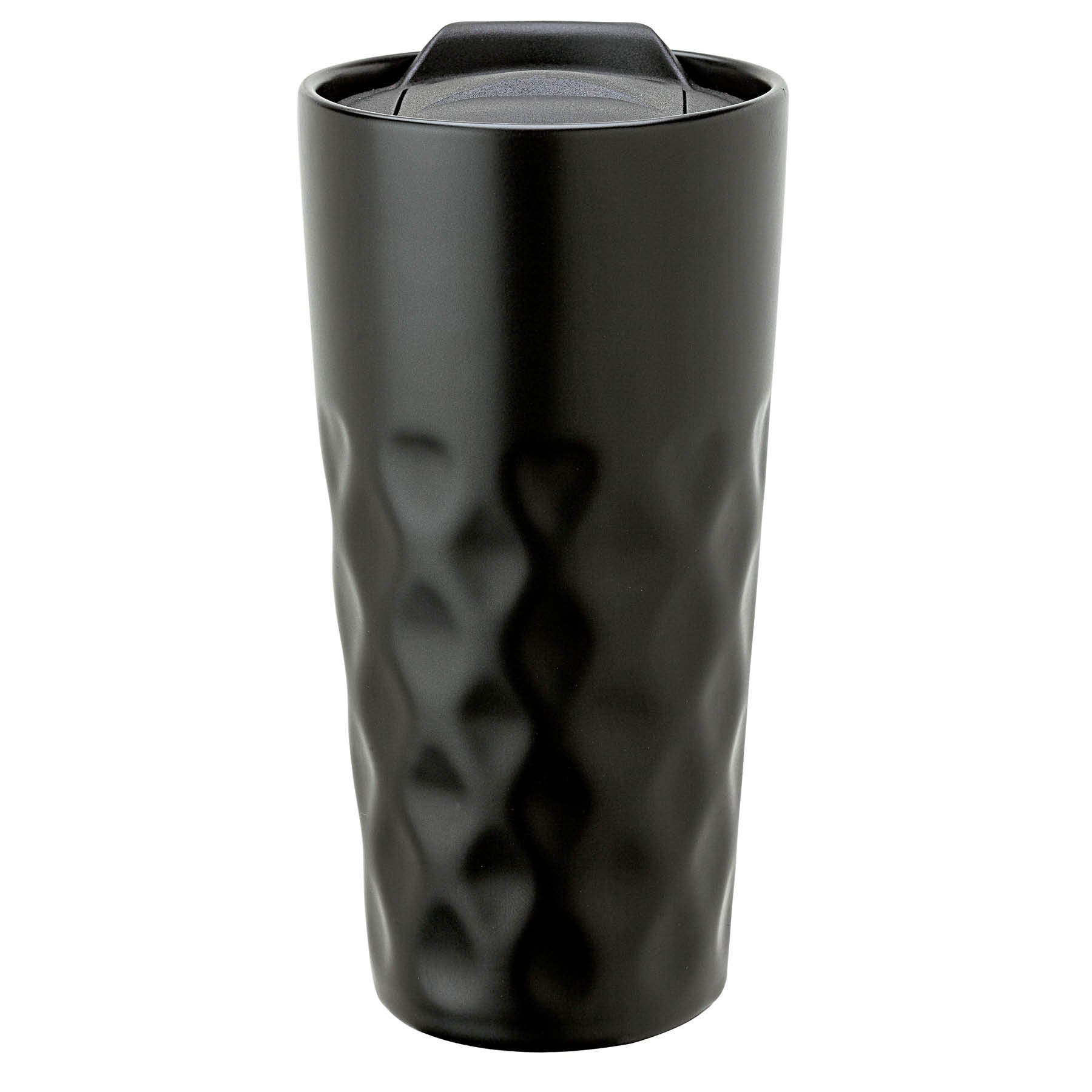 15 oz. capacity double wall ceramic tumbler has a diamond design textured grip and a polypropylene slider lid. Top shelf dishwasher safe.