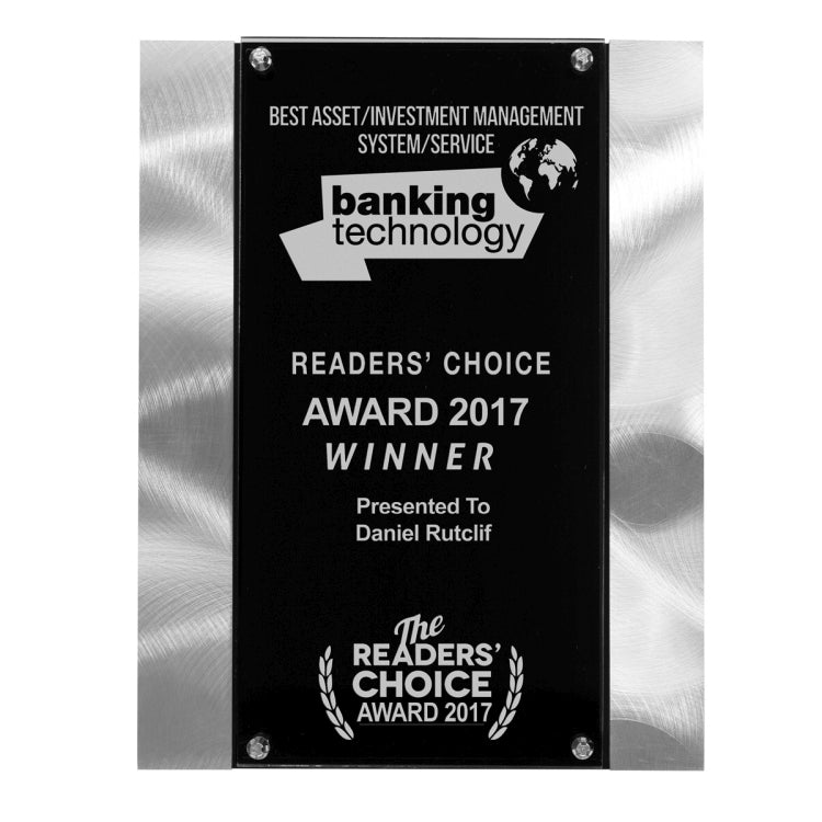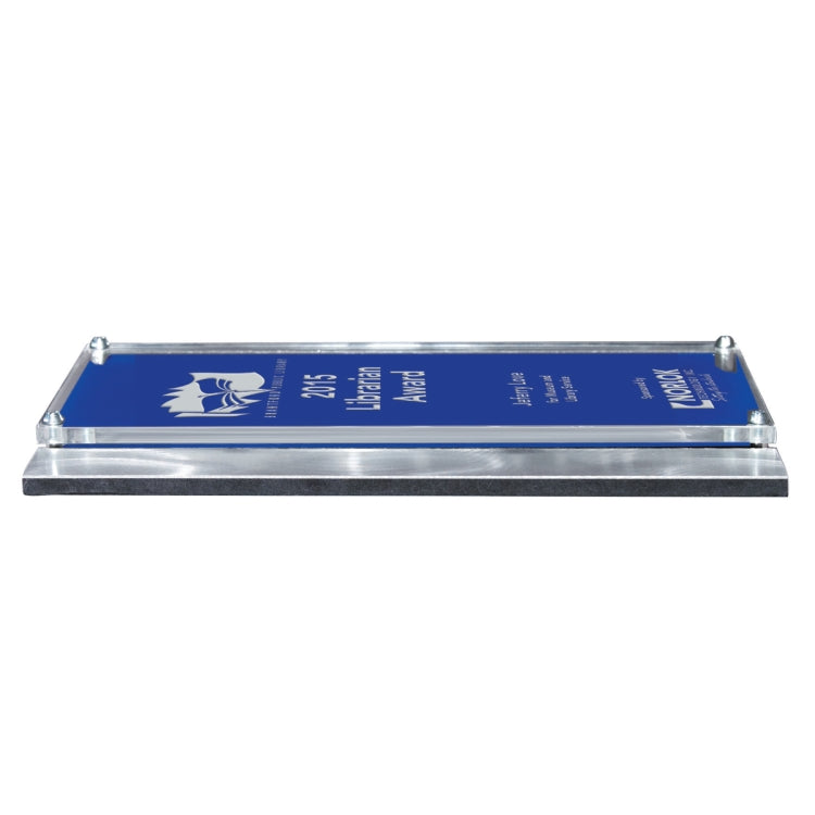 Vantage Plaques showcase your imprint over a standard or custom color background panel, suspended with decorative chrome hardware. They can be Screen Printed, Laser Engraved or 4 Color Process Printed.