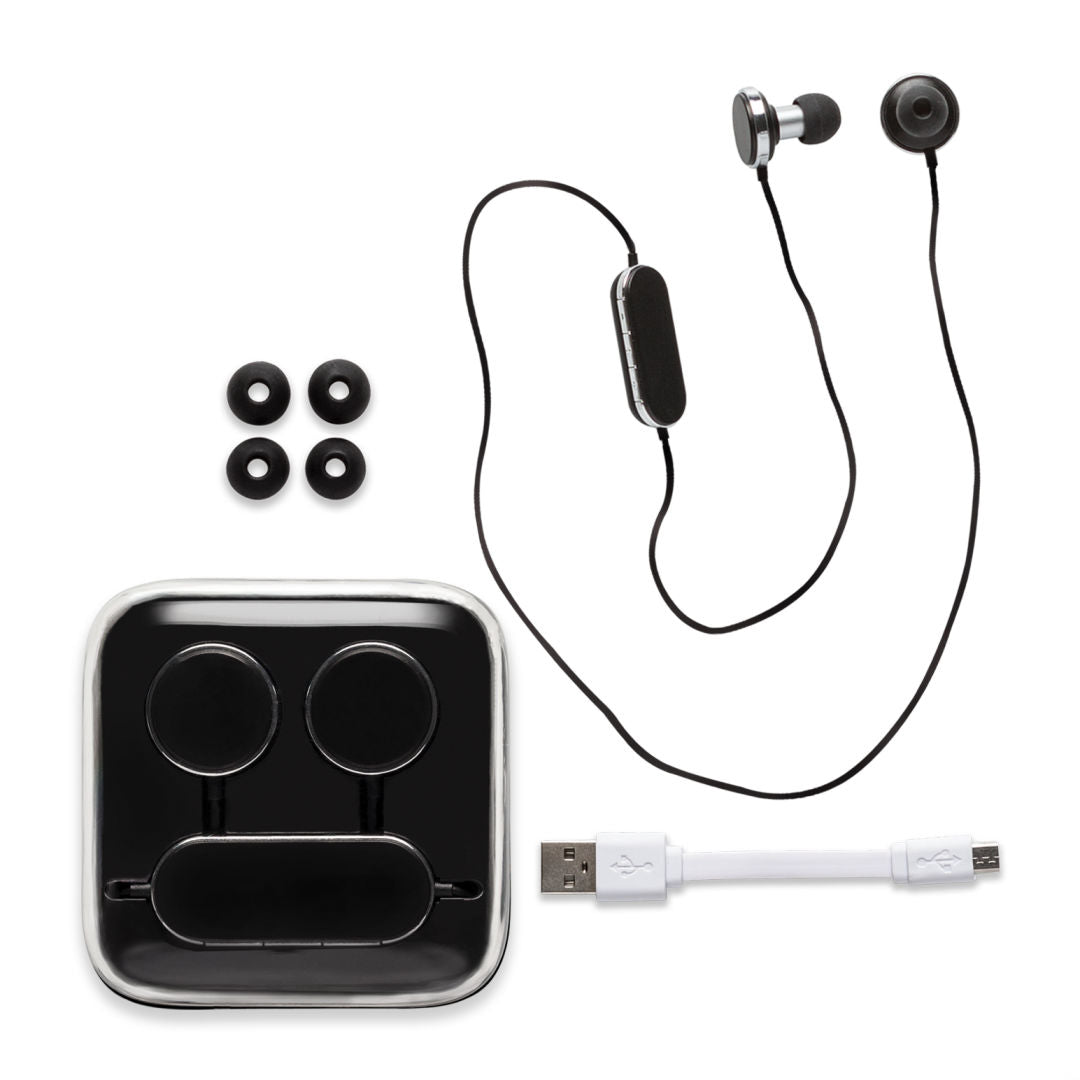 - Wireless technology, stereo earbuds in compact pocket case