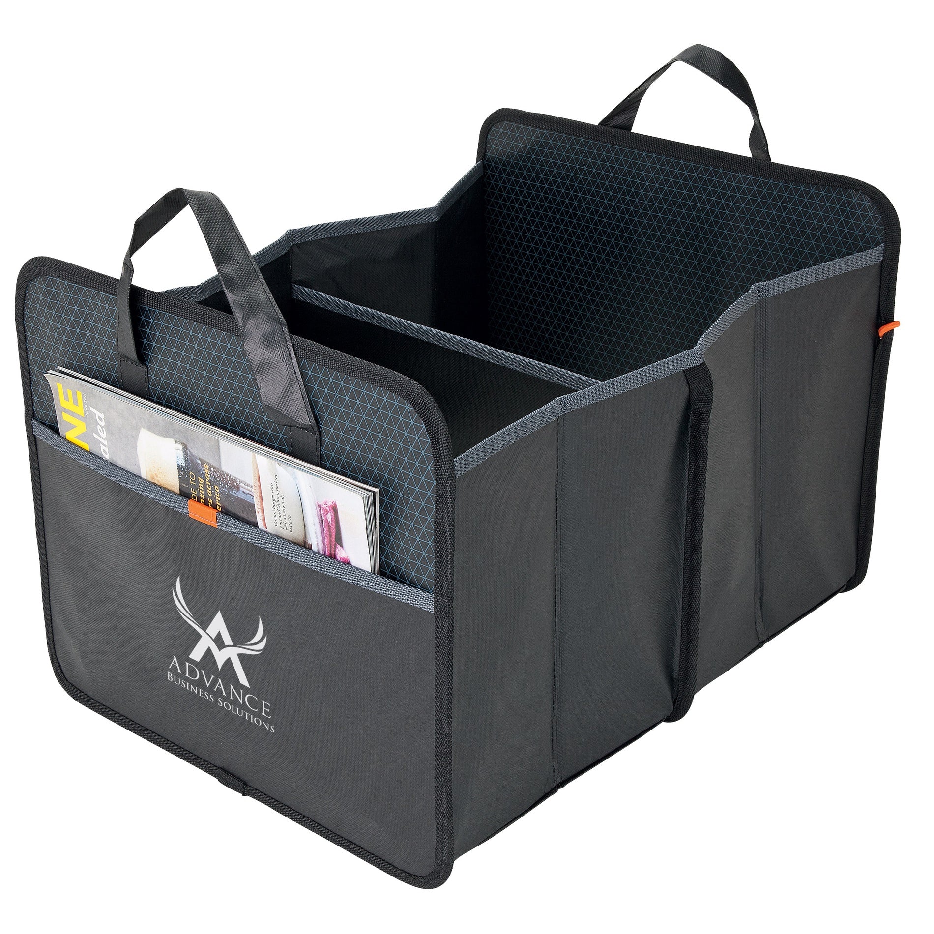 Two compartment trunk organizer with front pocket and carry handles folds down to 14 1/2" x 12 1/4" x 2 1/2". See details