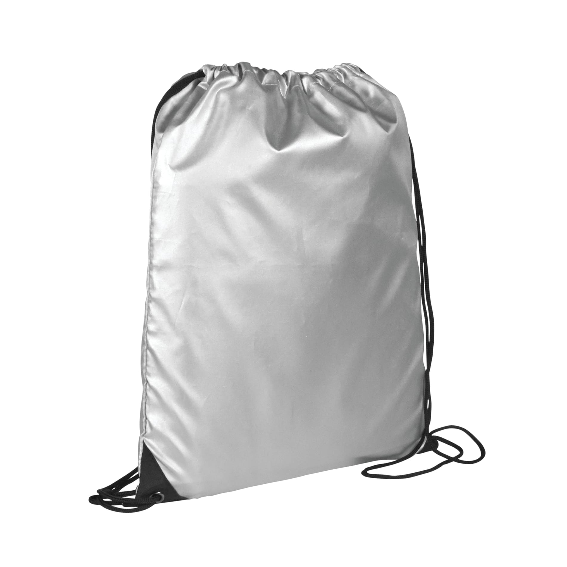 The Oriole Reflective Drawstring Bag includes an open main compartment with a cinching rope closure and reinforced bottom corner tabs.