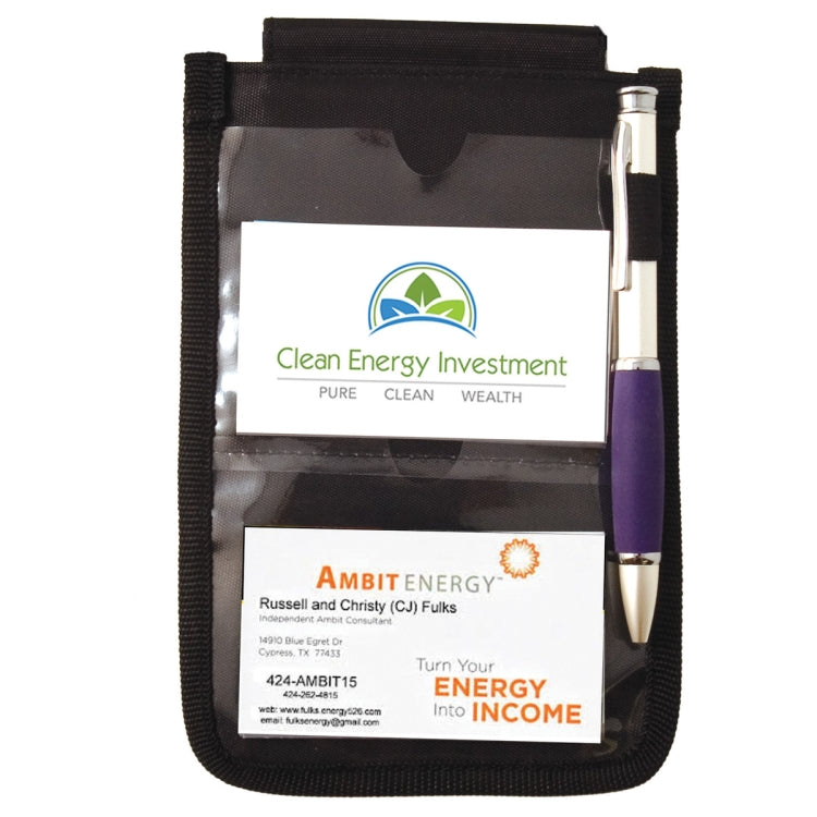 After the tradeshow, this product doubles as a handy travel document holder. Use the clear front pocket to hold your drivers license, the zipper pocket for your passport, and the 2 tall pockets for boarding passes, other documents, or a cell phone. • Adjustable neck strap. • Tall Zipper Pocket on front • Pen holder on back, Pen not included. • Two business card pockets on back. • Large ID Badge Holder Size: 4-1/4” W x 3-1/4” H • Backside Top Pocket: 4” W x 3” H Bottom Pocket: 4” W x 2-1/2” H, Backside has 2 clear pockets. • 2 additional tall slip-in open pockets on top.