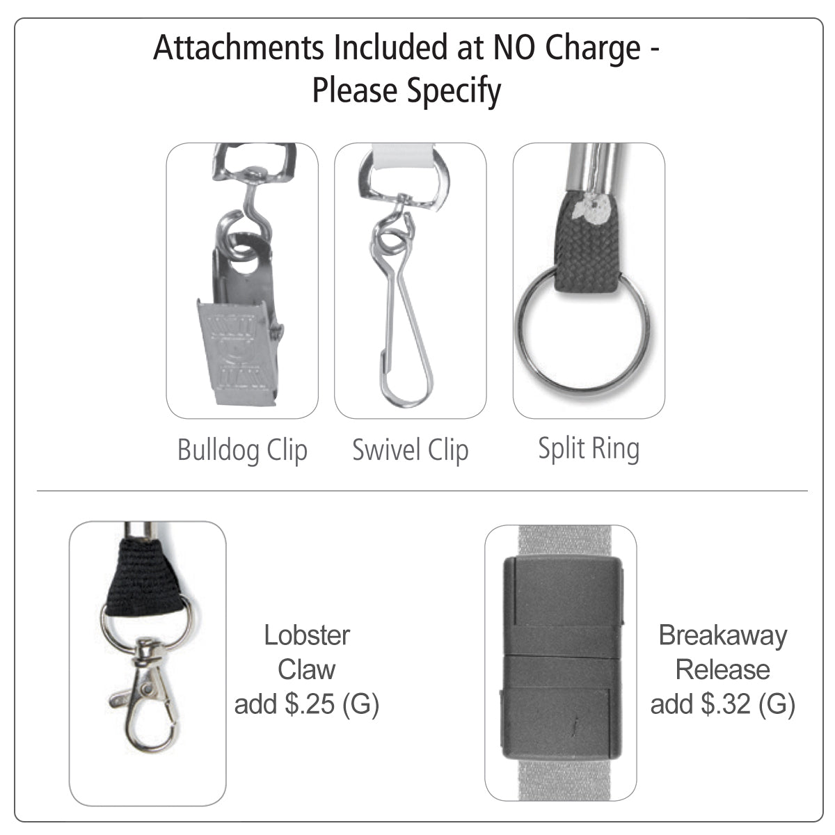 This Made in the USA lanyard* is 3/4” width and manufactured with an economical Textured Waffle Weave polyester. A full color sublimation imprint on the inside and outside of the lanyard is included in the price. NO extra charge for the standard lanyard attachments (split ring, bulldog or swivel clips as shown below). Add $.35G for a Lobster Claw attachment; Add $.35G for a Breakaway Release. QUICK DOMESTIC PRODUCTION.? Important Notice: To avoid shipping delays, please specify attachment - Bulldog/Alligator or Swivel Clip - when placing your order. * Made in the USA with domestic lanyard material and foreign metal attachment parts.