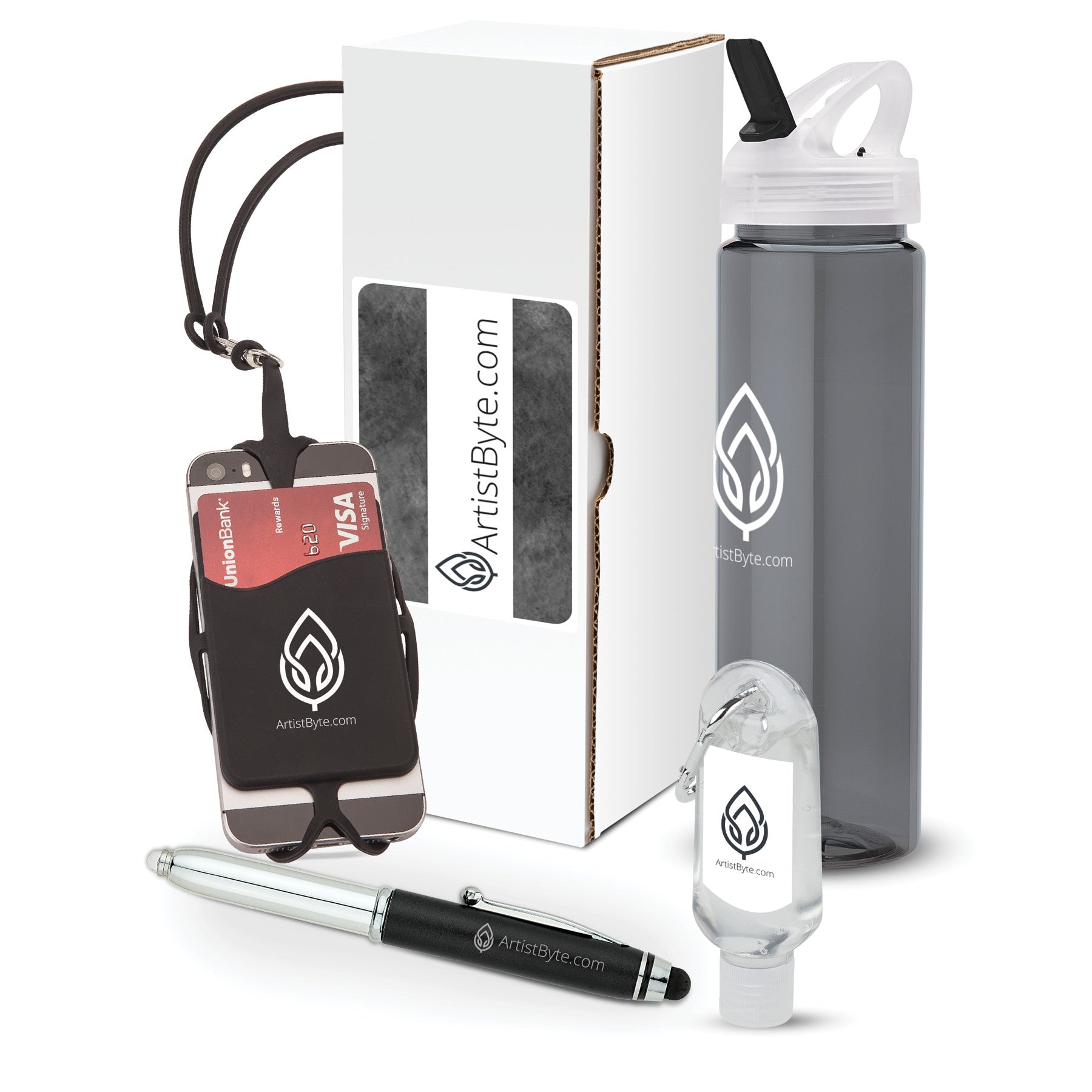 The Parlour 4-Piece Trade Show Gift Set is a generous gift to send to your employees and customers and comes packaged together in a customized gift box. It has a USA-made 25 oz. PET water bottle with an integrated carry handle and flip-spout and a silicone phone and card holder with a 16" lanyard. Your friends and employees can use and enjoy these items daily. The Parlour also inlcudes a 3-in-1 ballpoint pen with capacitive stylus and LED light and a 1 oz. hand sanitizer with a 50mm aluminum carabiner clip. Gift this set to show your appreciation and gratitude! Ground shipment only.