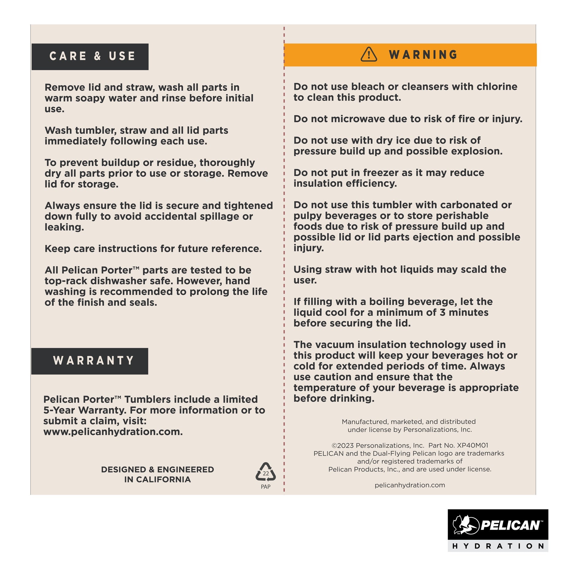 Stay hydrated throughout the day with the 40 oz. Pelican Porter™ Dual Travel Tumbler, your ideal companion for all of life’s adventures. Featuring a leak resistant, dual-function lid with locking mechanism this large capacity cup has both a sipper hole with flip-cover for drinking hot liquids and a flip-up straw spout for enjoying cold beverages. Designed with sustainability in mind, it’s made from 90% recycled pro-grade 18/8 stainless steel and the double-wall vacuum insulation, combined with copper lining, ensures that your drinks stay hot for up to 9 hours and cold for up to 16 hours. The ergonomic, double-injected handle provides a comfortable, soft-touch grip, while the durable powder coat finish is scratch-resistant and sweat-proof. With a tapered base that fits most cup holders and leak-resistant lid, the Pelican Porter™ Dual is the ultimate travel tumbler for your on-the-go lifestyle. FDA compliant and BPA-free.
