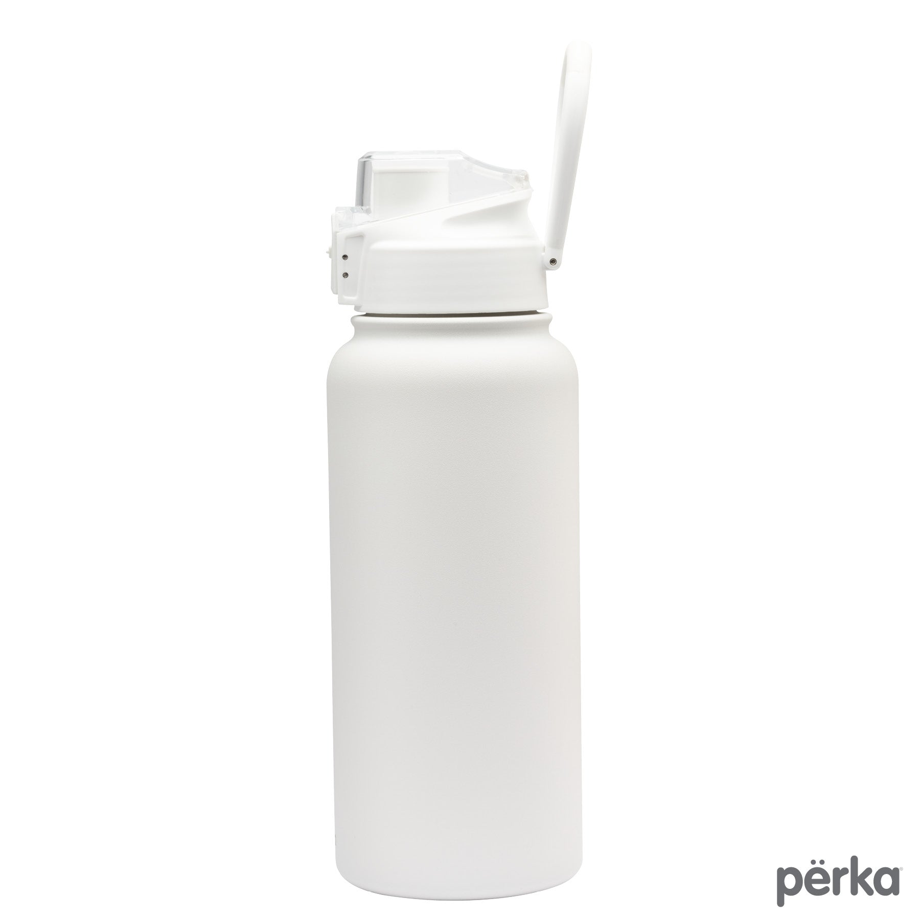 The Perka® 32 oz. Rex Water Bottle has an 18/8 double wall stainless steel vacuum insulated construction that will keep your drink cold for 36 hours and hot for 24 hours. The dual opening lid features a locking press-button opener, Tritan cover to protect the chug drinking spout, a hinged handle with soft co-molded TPR grip for easy and comfortable carrying and a wide-mouth opening for easy cleaning and adding ice. The sweat-proof powder coated finish provides a non-slip grip and durable protection from bumps and scrapes. The Rex-32 Bottle will surely become your favorite companion for the gym, office or outdoor activities. FDA compliant and BPA Free. A portion of all proceeds is donated to Shelter to Soldier™, a non-profit organization that rescues dogs to train as service animals for veterans in need.