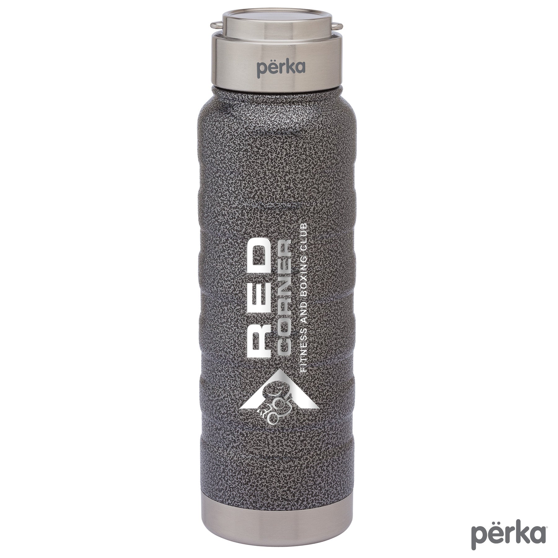 The Perka® Roak 304 stainless steel bottle has a double wall construction with vacuum seal and copper lining for added insulation. This bottle features a ridged grip for easy handling and a stainless steel twist off cap with silicone ring. The exterior is powder coated to reduce sweating and the cap has a hinged steel carry handle for easy pick up. Liquids stay hot for 12 hours and cold for 24. FDA Compliant and BPA Free. A portion of all proceeds is donated to Shelter to Soldier™, a non-profit organization that rescues dogs to train as service animals for veterans in need.