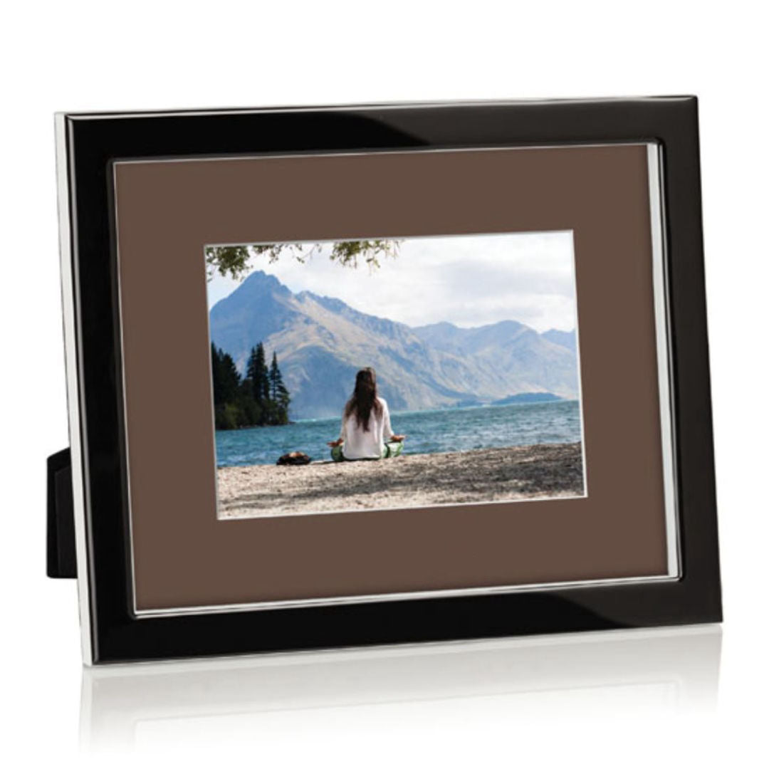 Molded ebony Lucite, polished to an ultra glossy shine, surrounds a wide matte for this elegant frame display.