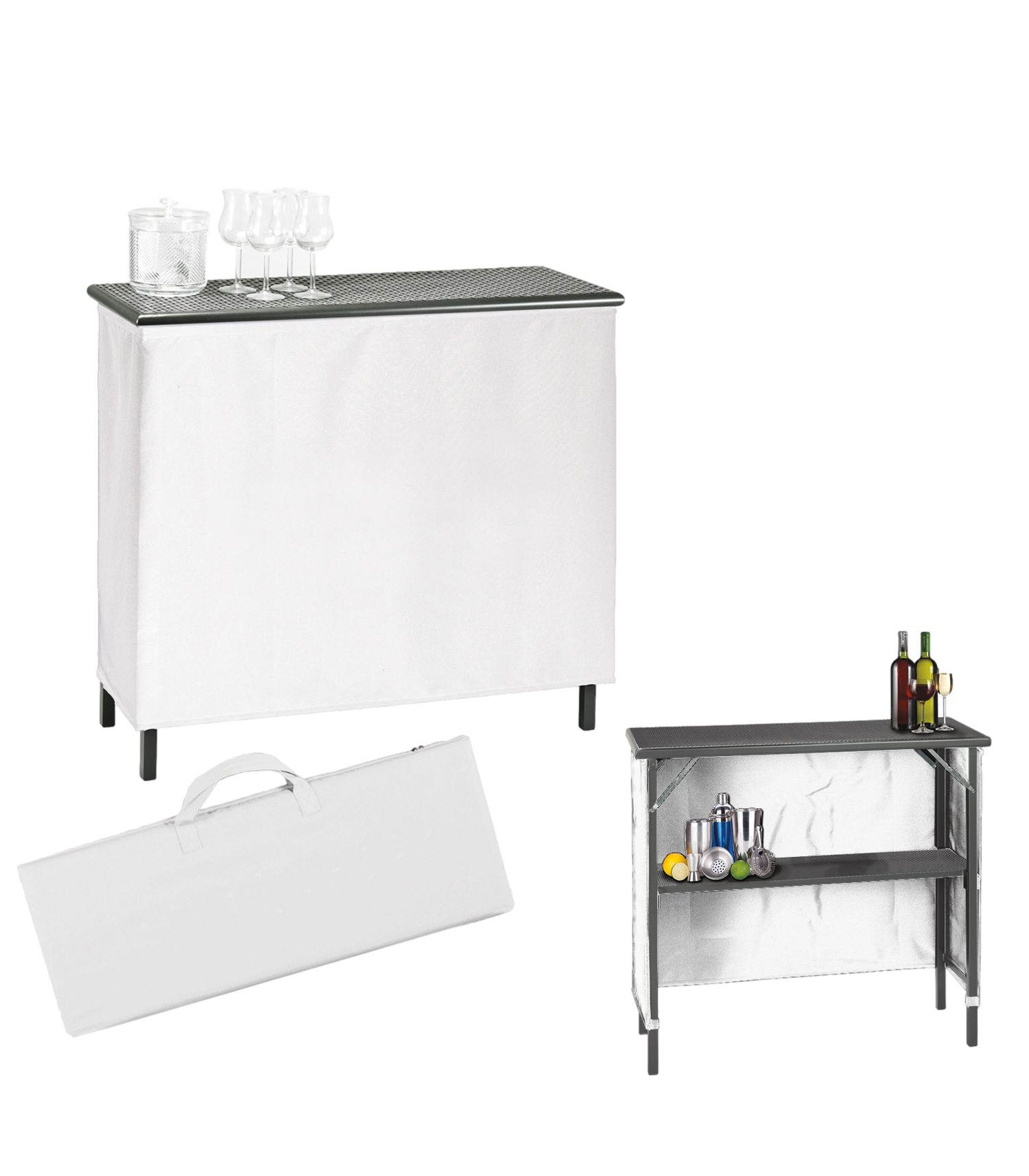 Everyone knows that snacks and cocktails always draw the crowd! easily create a visible prescence with this Portable Folding Bar. Featuring a sturdy steel construction with drop-down shelf and long polyester skirt, this table sets up and breaks down without any tools and includes a carry case for easy transport. Cheers!