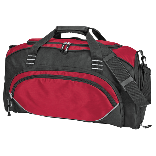 Durable 600D black polyester non-PVC backing material with bold color dobby accent; reflective gray piping; large double zipper main compartment; 2 front zipper pocket; 1 side zipper pocket; vented zippered shoe pocket. *Embroidery includes 5K stitches