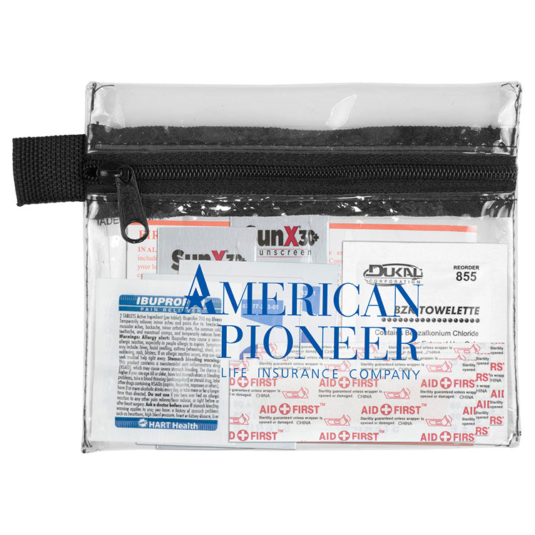 This zippered pouch contains: 3 Standard Size Latex Free Bandages, 1 Small Size Latex Free Bandage, 1 Antiseptic Towelette, 1 Moist Towelette, 2 Antibacterial Hand Sanitizer Packets, 1 Triple Antibiotic Ointment and 1 Healthy Guidelines Insert.