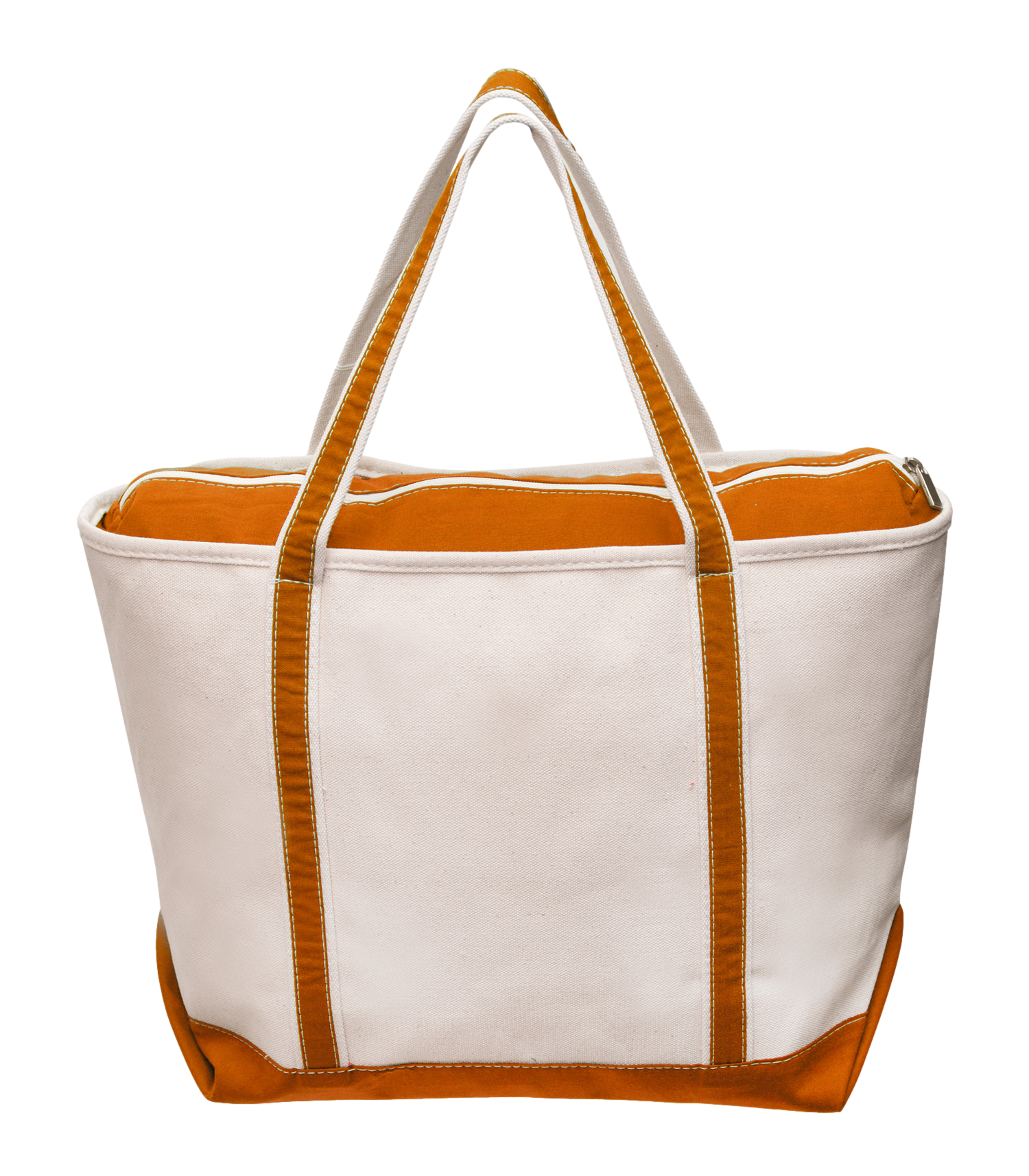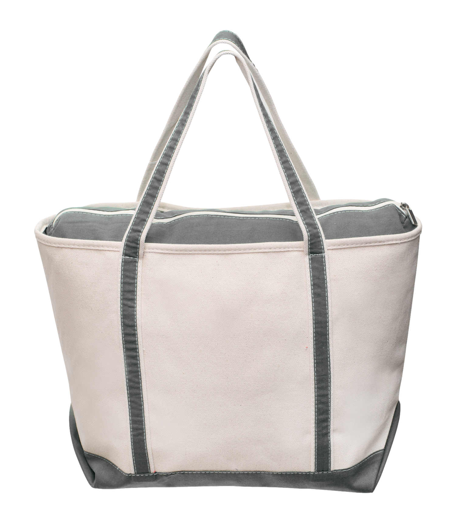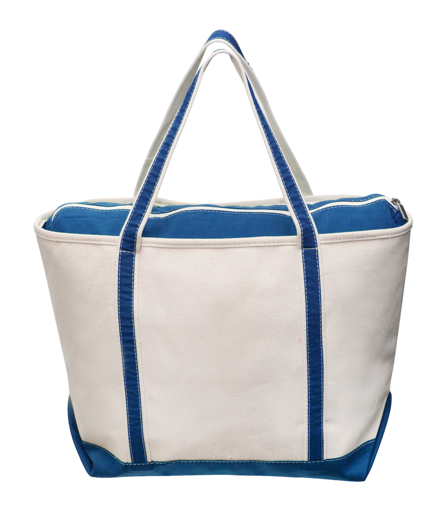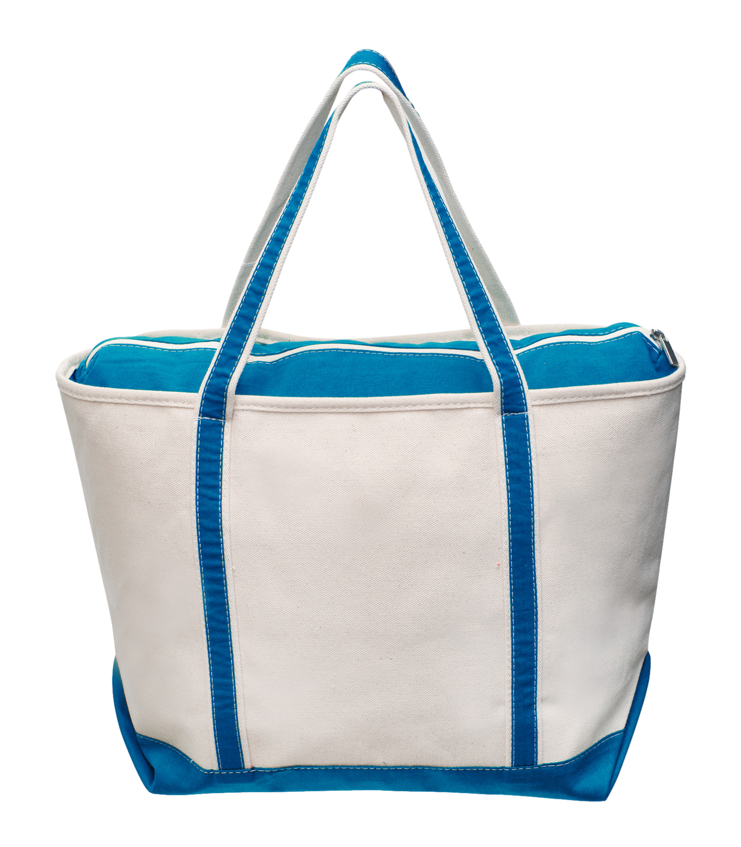 Keep personal belongings secure while on an outing when they're stored in this classic, nautical sailing/boat tote! This large sized, 24 oz. canvas carrier measures 21 1/2" x 13 1/2" x 7 1/2" and comes in a natural color with your choice of accent color. Features include an interior hanging zippered pocket, silver d-ring for your keys or a key chain, closed interior seams and a zippered top closure.