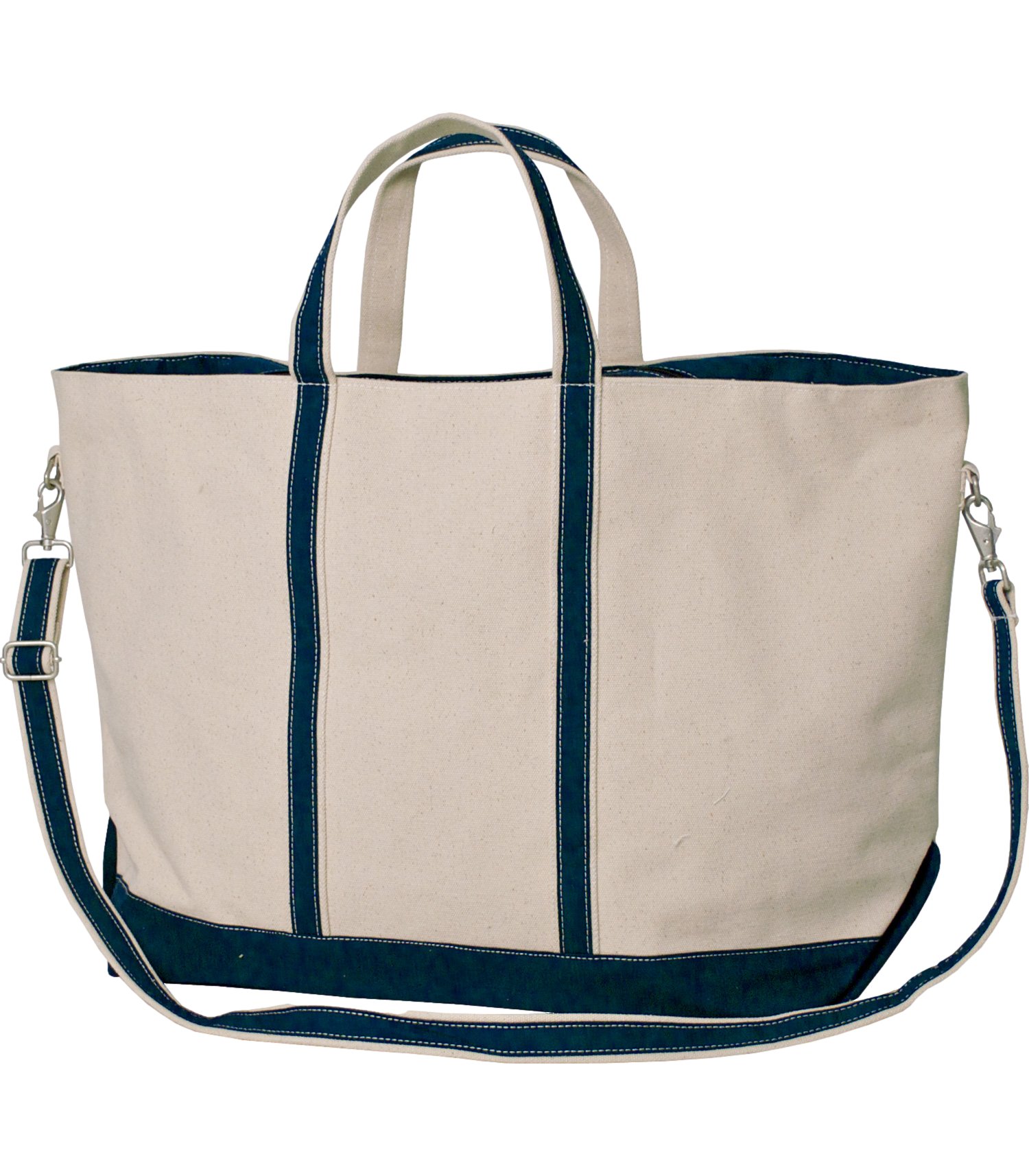 Practical and chic, our extra-large sailing/boat tote is the perfect companion for trips to the beach, running errands and much more! Constructed of 24 oz. canvas with measurements of 27" x 17" x 9", this versatile carrier features durable closed interior seams, zippered top, detachable shoulder strap and an interior pocket with silver d-ring for your keys or a key chain. It's offered in natural with your choice of accent colors.