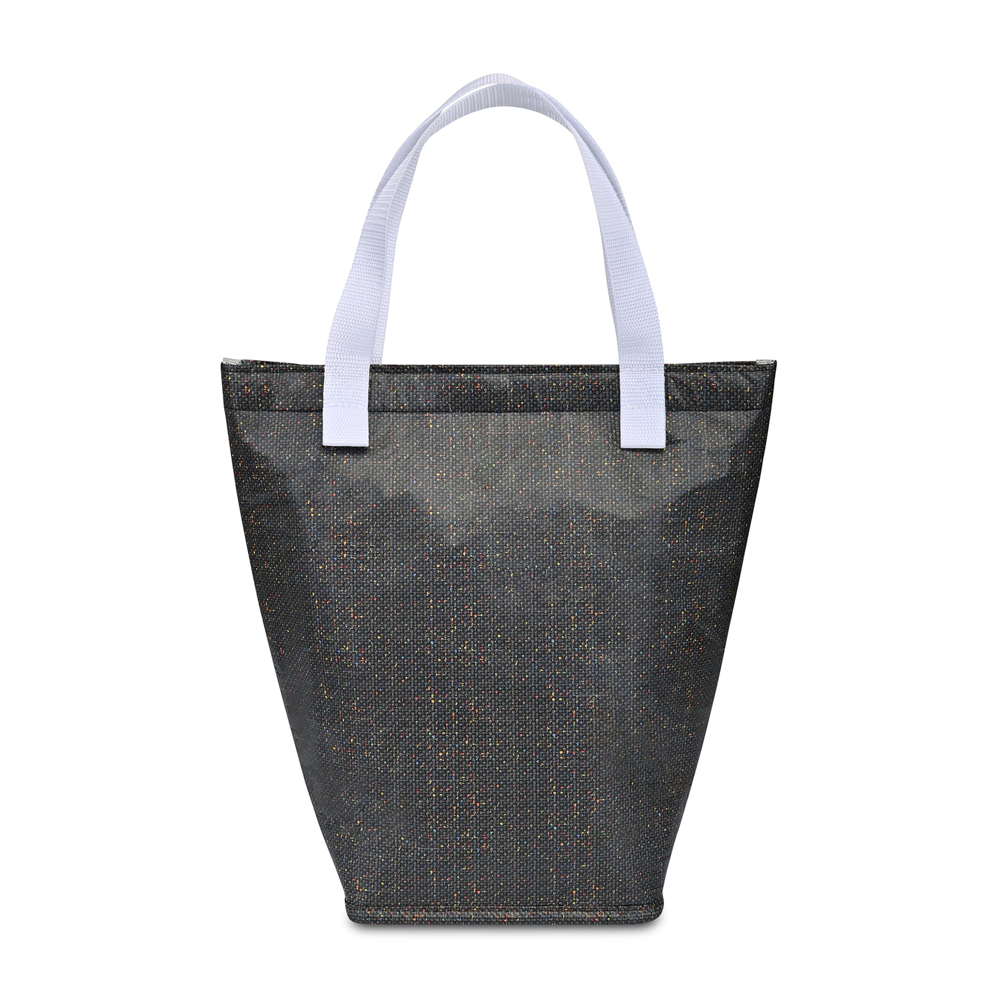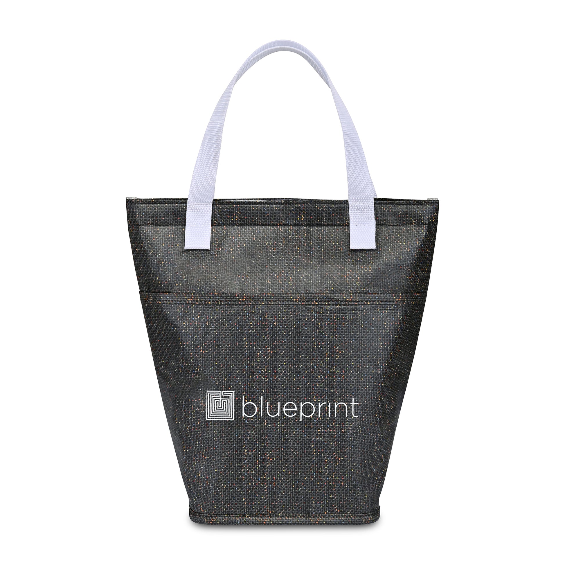 The Sami Cooler Collection features recycled laminated nonwoven material with a fashionably subtle fleck detail. Wipeable and durable PEVA lining. Hook and loop closure. Front slash pocket. Dual tote-style handles for easy carrying. One color screen print only. Holds 10 cans.
