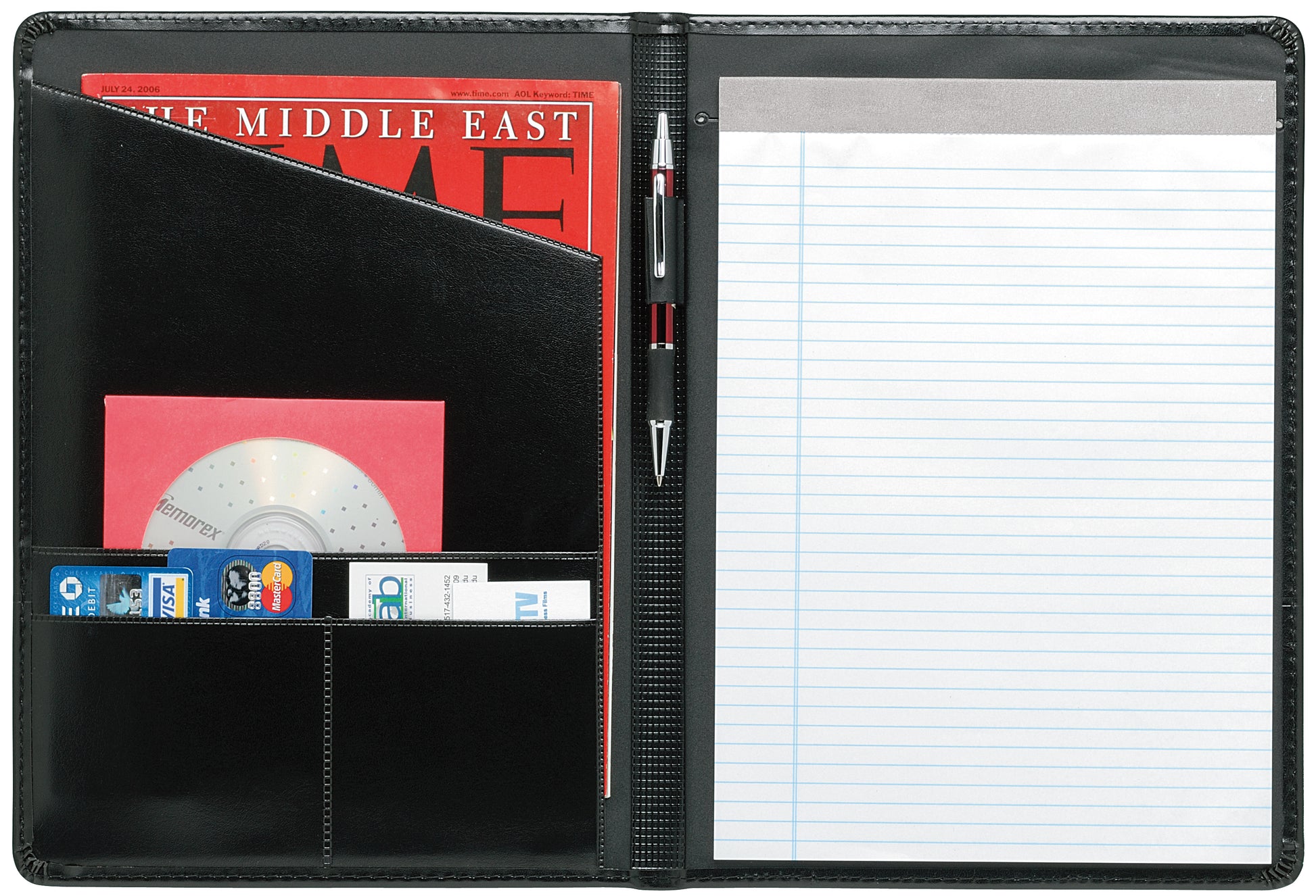 This padded portfolio has lots of features to keep you organized, including a lined notepad, numerous interior pockets, and a vinyl pen loop.