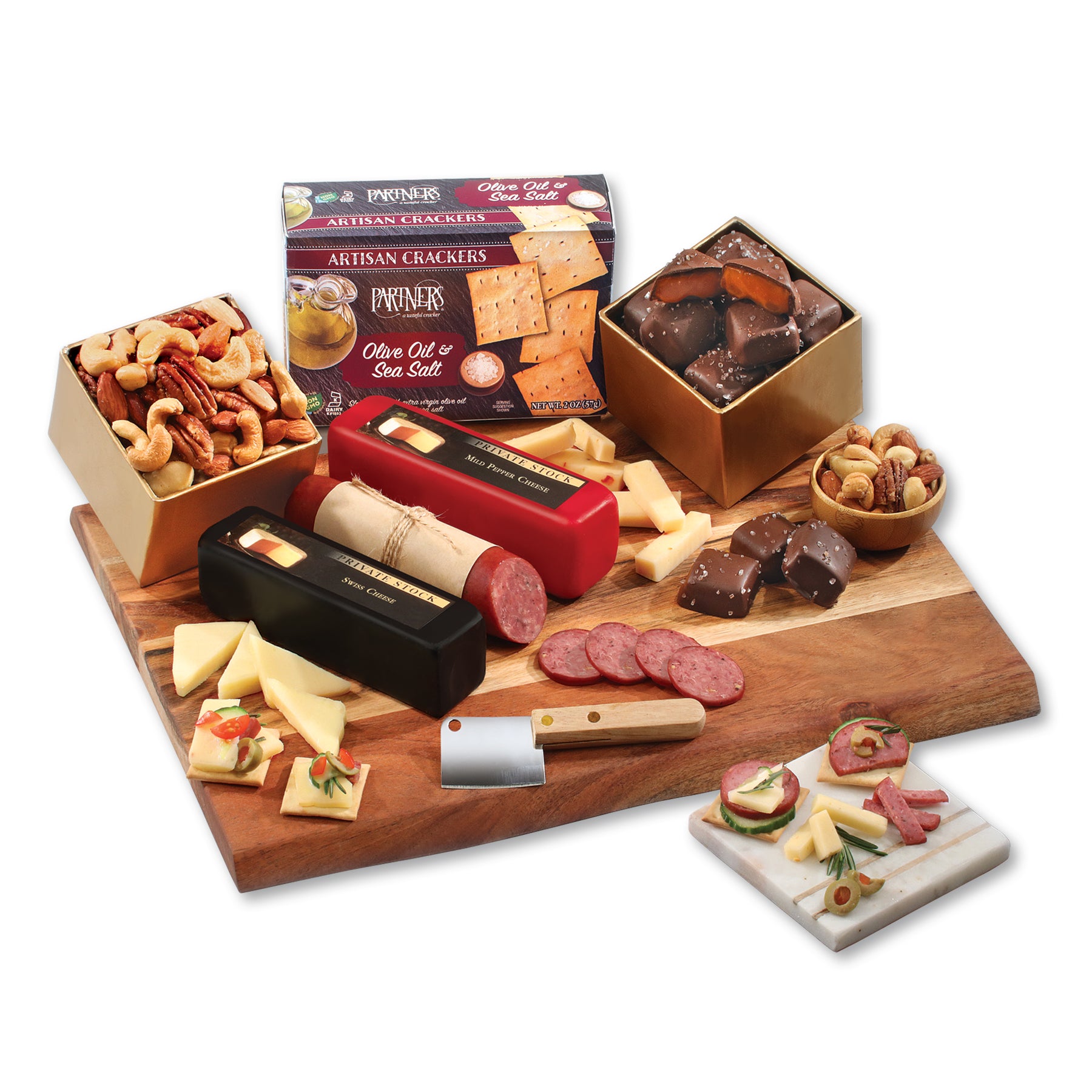 This oversized, sustainable Acacia board (15" x 11.75") is firebranded with your logo and accompanied by some of our amazing favorites. After nibbling on gourmet Wisconsin shelf stable cheese and sausage, crunch some fresh-roasted deluxe mixed nuts and top off the flavor experience with creamy chocolate sea salt caramels. Snacking doesn't get better than this! Serves 8-12. Contents: Mild Pepper Cheese, 7 oz. Swiss Cheese, 7 oz. Beef Summer Sausage, 5 oz. Deluxe Mixed Nuts, 5 oz. Olive Oil & Sea Salt Crackers, 2 oz. 8 Chocolate Sea Salt Caramels, 4.75 oz. Meat & Cheese Cleaver