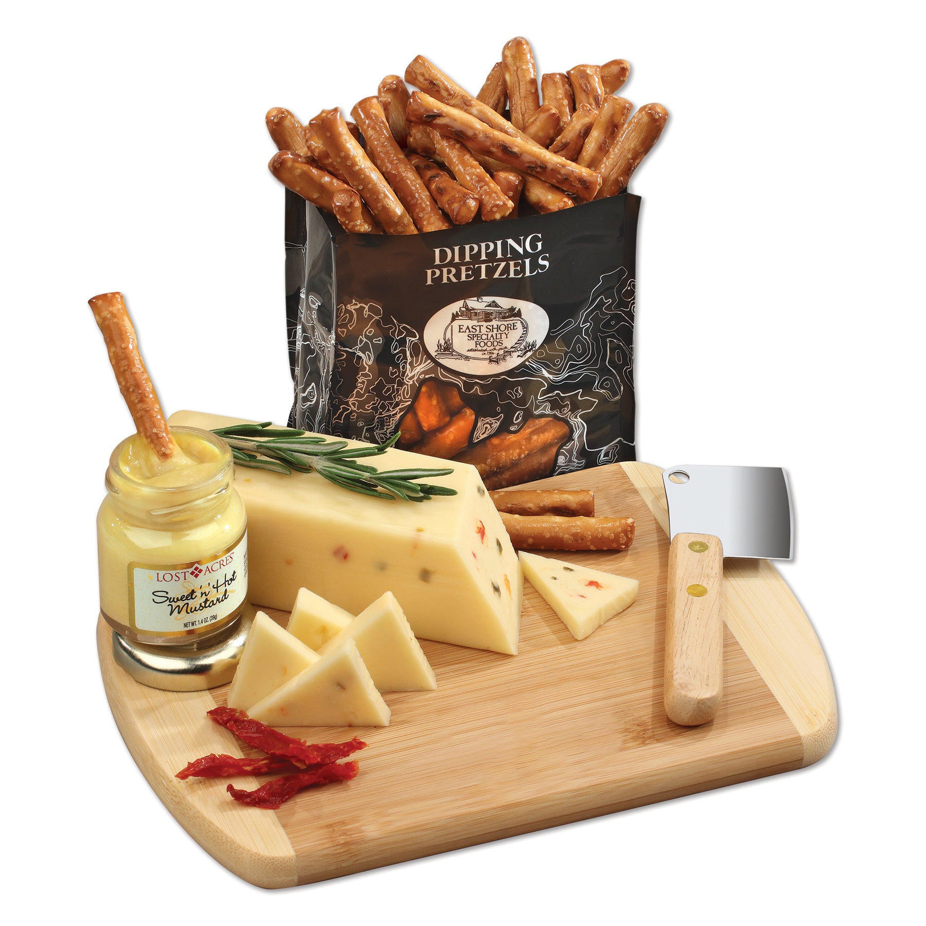 Looking for that simply perfect snack assortment? Look no further! This sustainable bamboo board comes firebranded with your logo and packed with a block of shelf stable mild pepper cheese, pretzels, and gourmet mustard for dipping. Great for any setting or occasion, this gift is sure to be a hit with every recipient! Contents: Private Stock Mild Pepper Cheese, 7 oz. Dipping Pretzels, 2 oz. Sweet & Hot Mustard, 1.4 oz. Meat & Cheese Cleaver